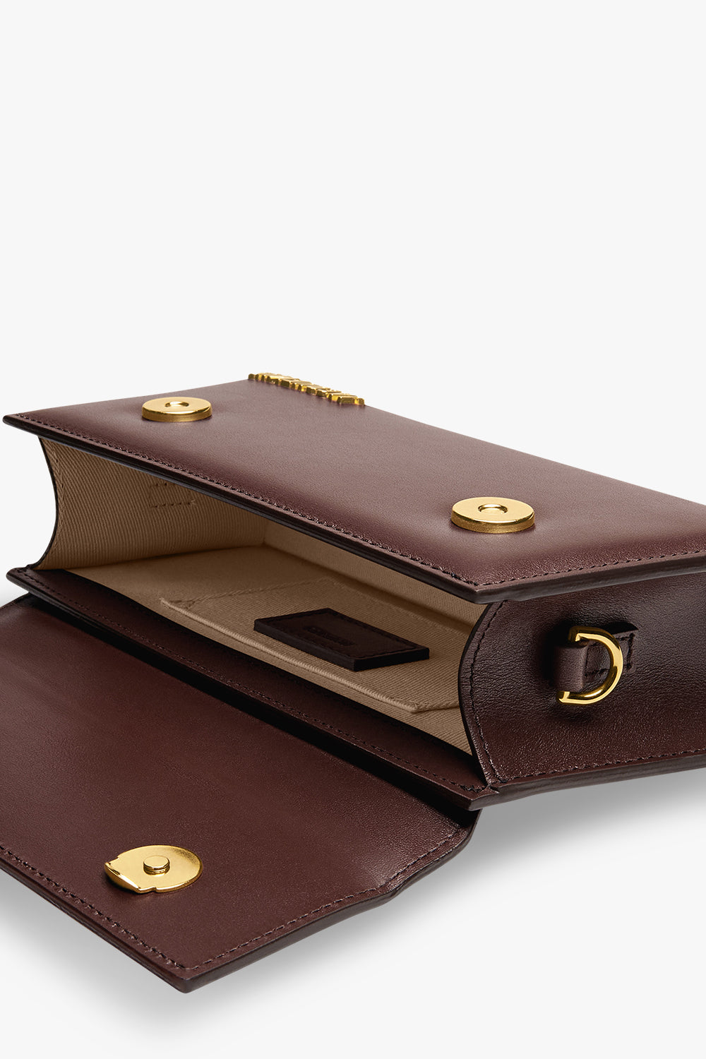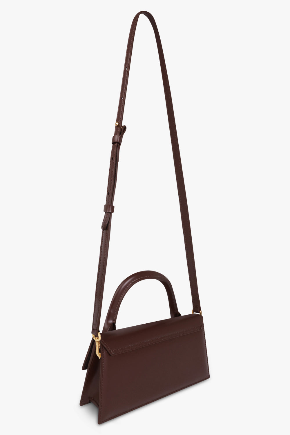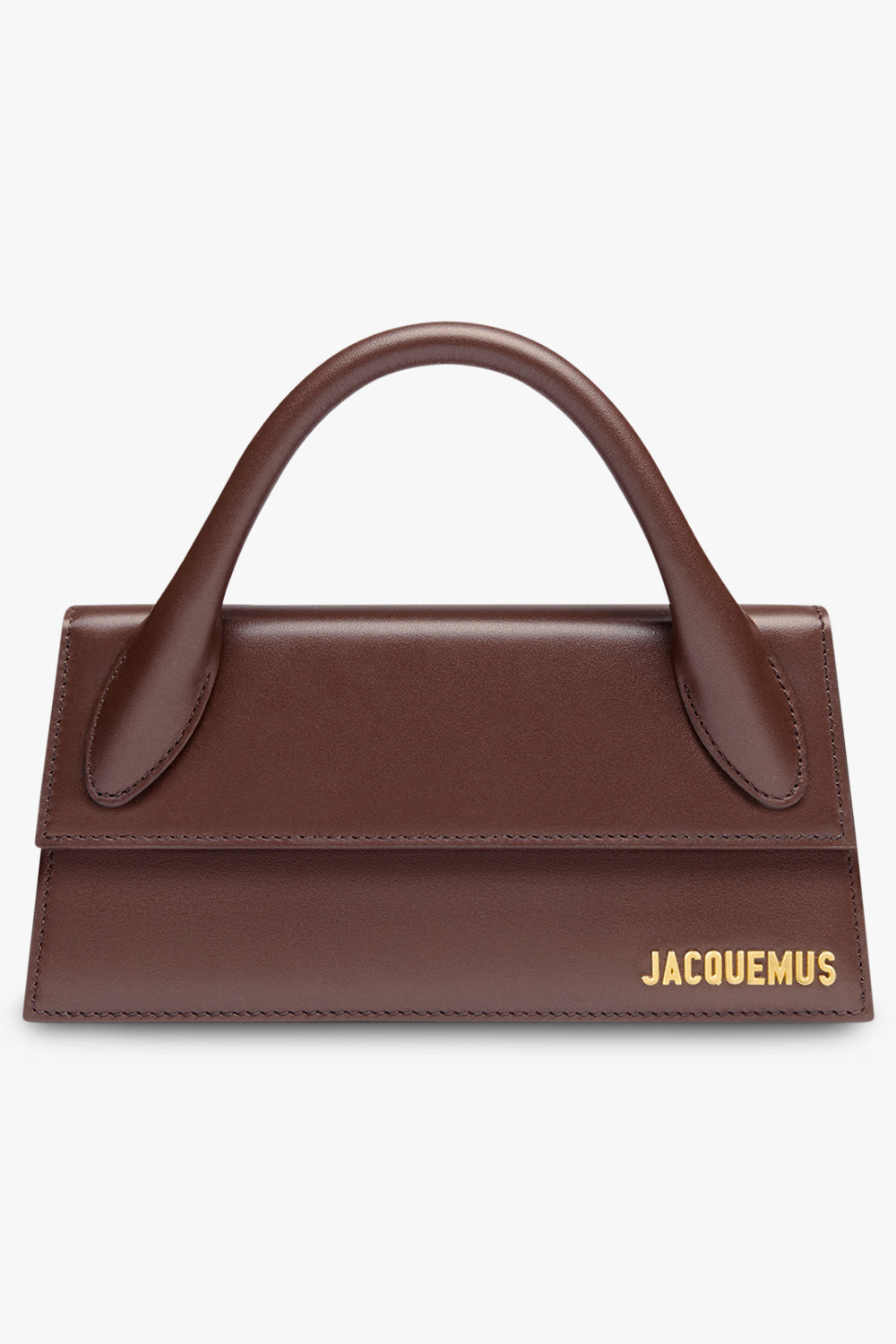 The Jacquemus Le Chiquito Long Leather Bag in Brown is crafted from calf leather, featuring a round top handle, a detachable and adjustable shoulder strap, a fold over top with magnetic closure and a main internal compartment and a gold-tone logo plaque.