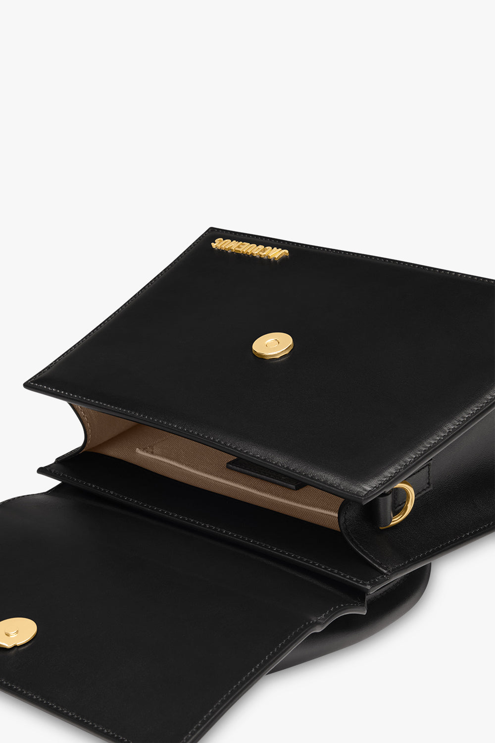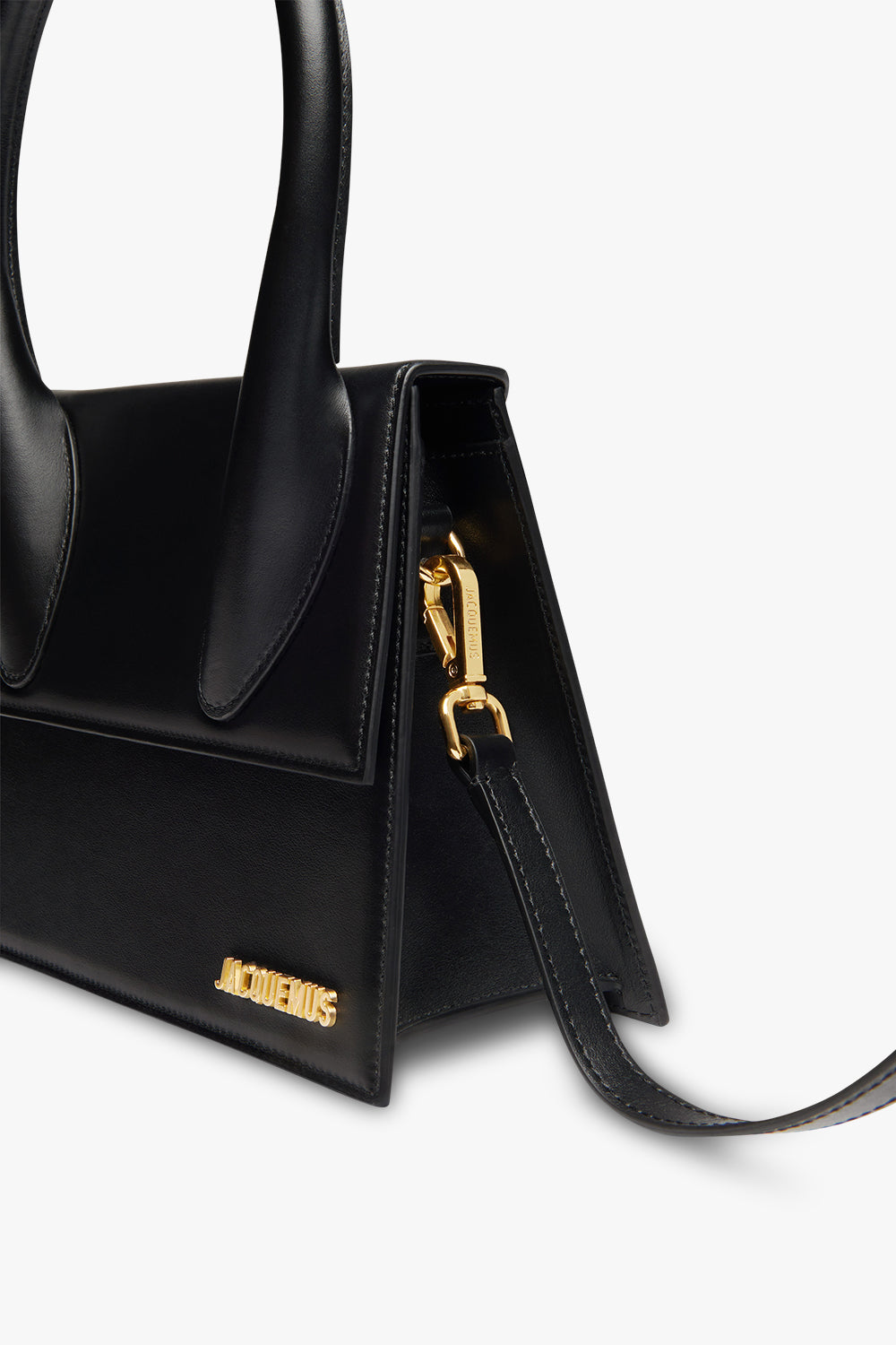 The Jacquemus Le Grand Chiquito Bag in black features a round top handle, a detachable shoulder strap, a fold over top with magnetic closure and a main internal compartment and a gold-tone logo plaque.