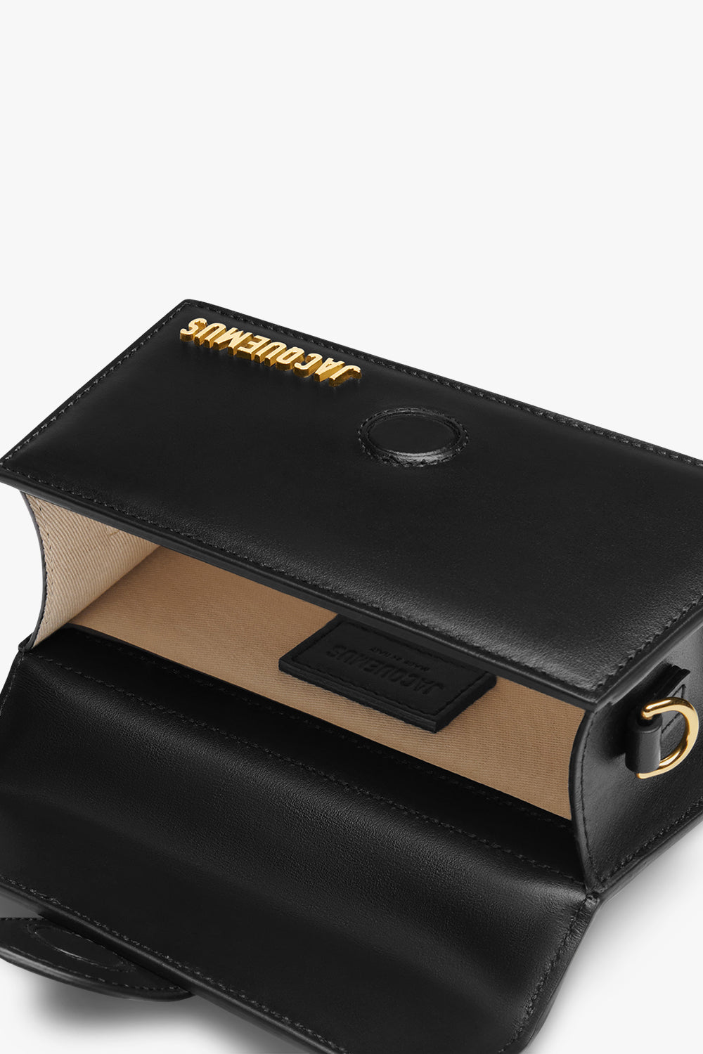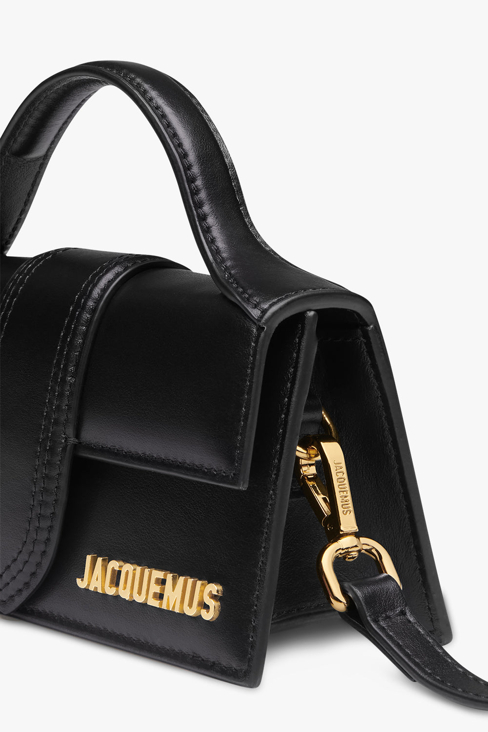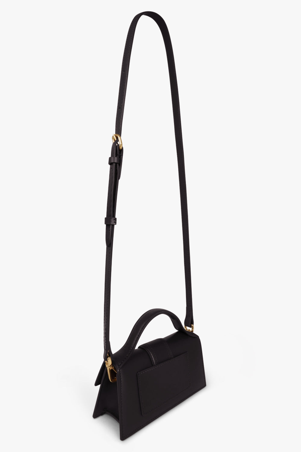 The Jacquemus Le Bambino Bag in Black is crafted from a calfskin leather and features a small top handle, a removable strap, a rear pocket, flap magnet closure and a gold-tone logo plaque.