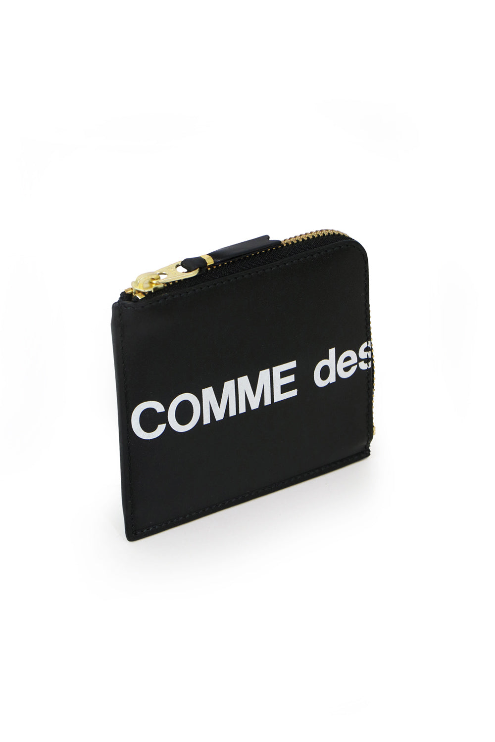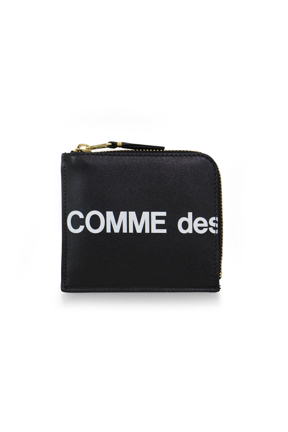 The Comme Des Garçons Huge Logo Zip Wallet is a signature for the brand. Featuring a bold white logo, gold tone zip closure, pouch wallet, smooth leather, logo in large font across front and back, tonal stitching. This perfect everyday wallet is made from calfskin. Crafted in Spain.
