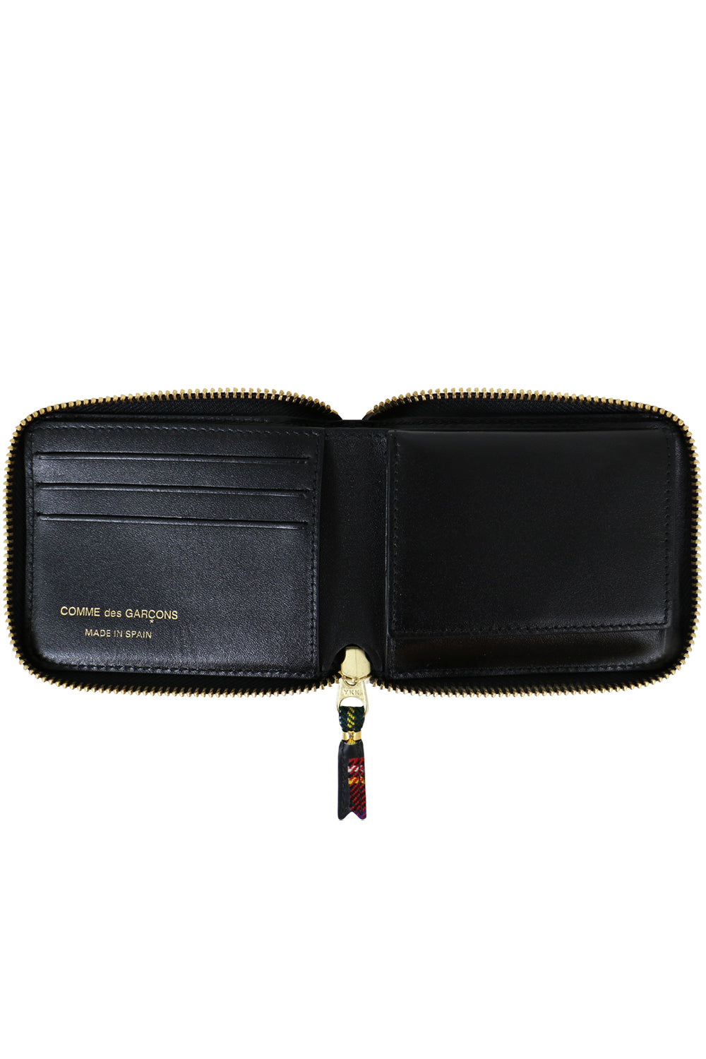 The Comme Des Garçons Tartan Patchwork Wallet in Red features a unique wool patchwork design with a zip closure, four card slots, one note slot, coin pouch and logo embossed interior.