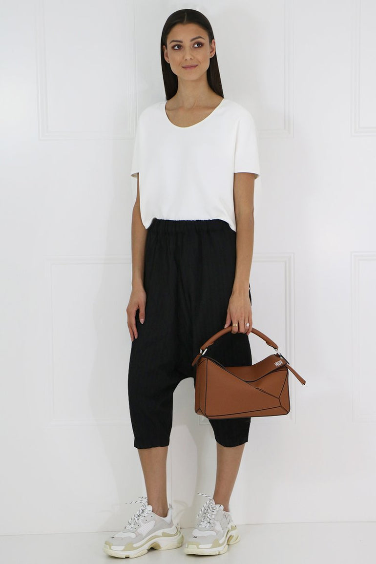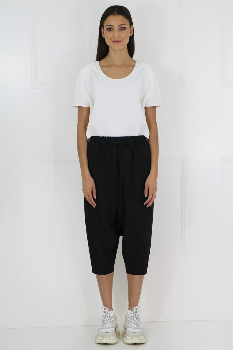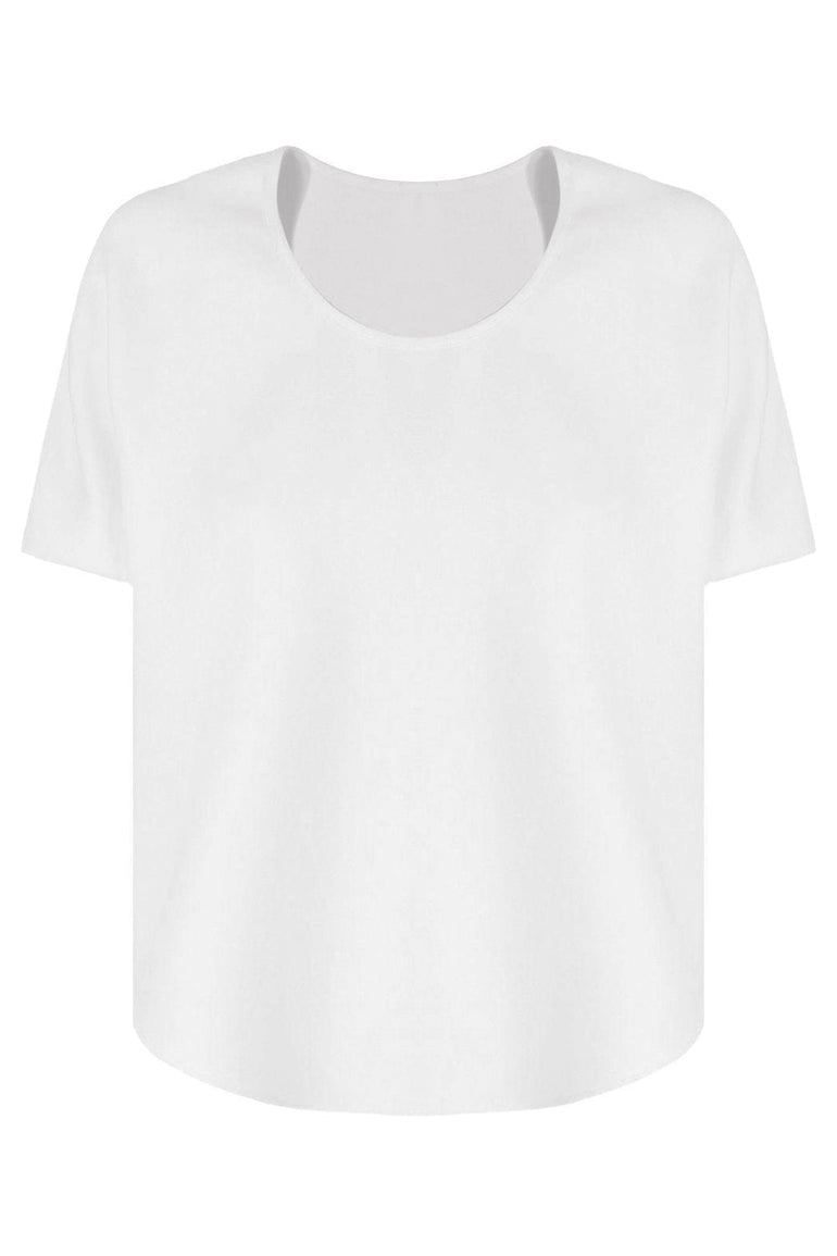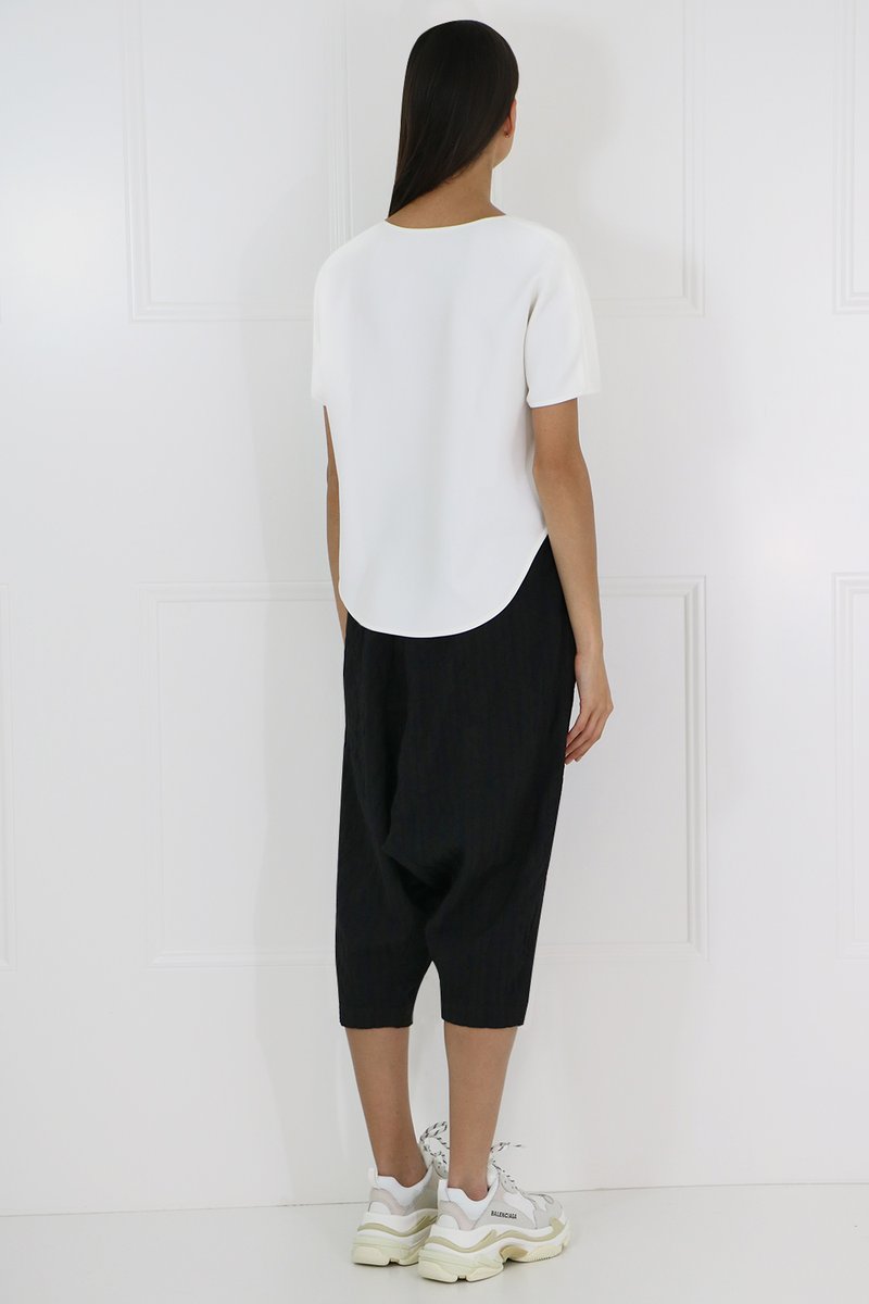 The Maison Poi E Top features cap sleeves and a round neck. It is cut in a loose, cropped silhouette with a longer hemline at the back.