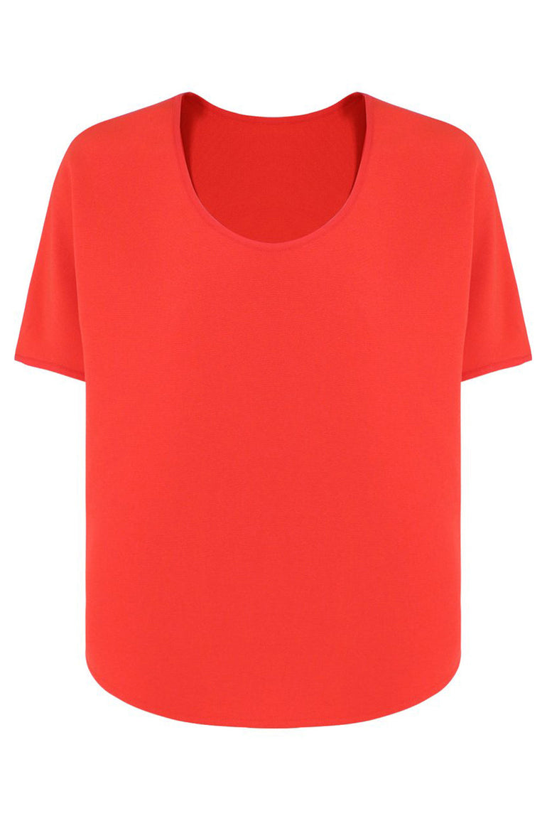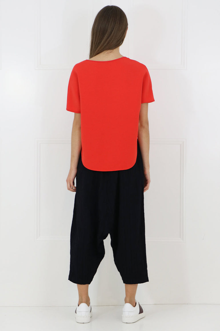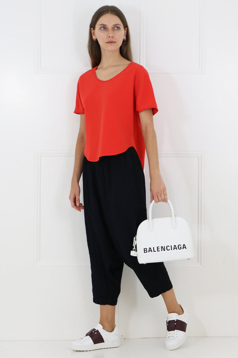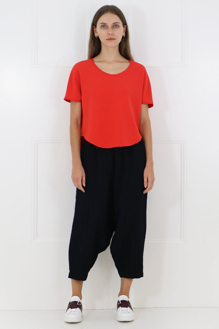 The Maison Poi E Top features cap sleeves and a round neck. It is cut in a loose, cropped silhouette with a longer hemline at the back.