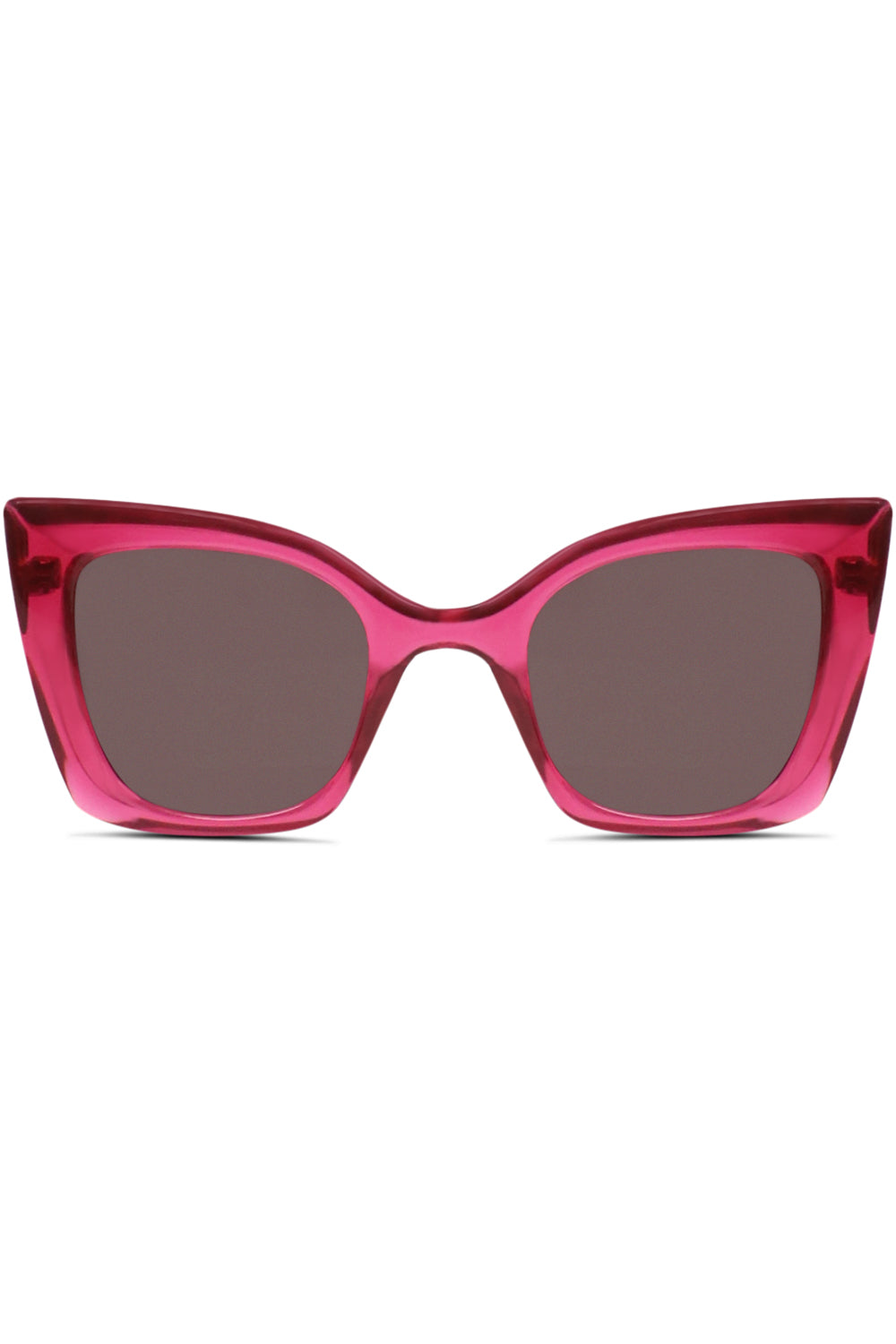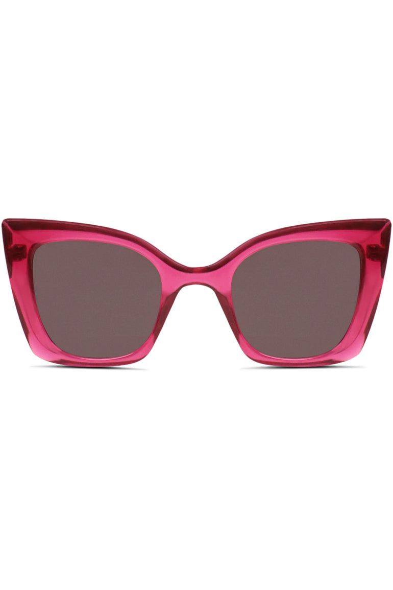 The Saint Laurent 552 Cat Eye Sunglasses in Cyclamen pink feature a thick cat eye frame with nylon lenses. It features black lenses with 100% UV protection and Saint Laurent logo at the temples.