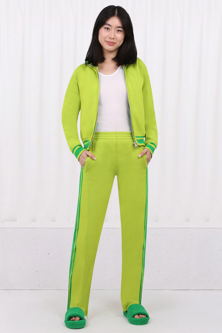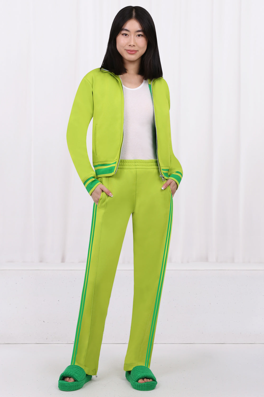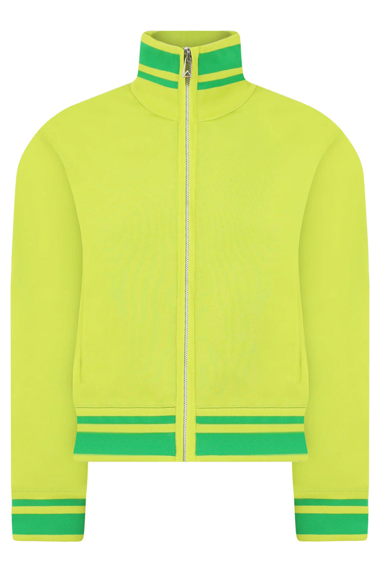 The Bottega Veneta Sport Jacket in Kiwi/Parakeet is crafted from a lightweight double technical knit fabrication. This style features front zip closure, a contrast stripes at the collar, cuffs and hem, and is designed for a relaxed fit.
