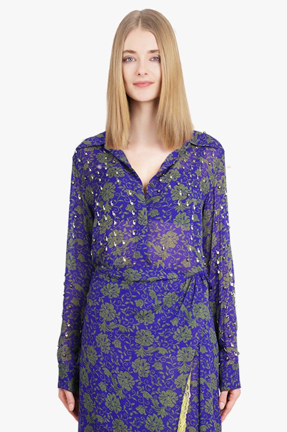 Fitted design with buttoned cuffs, concealed front button closure, and semi-sheer fabric.