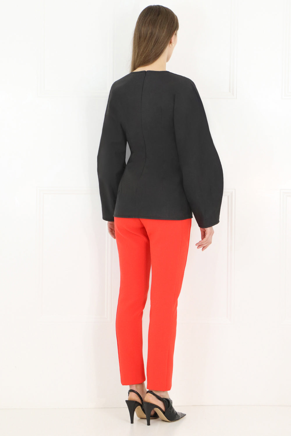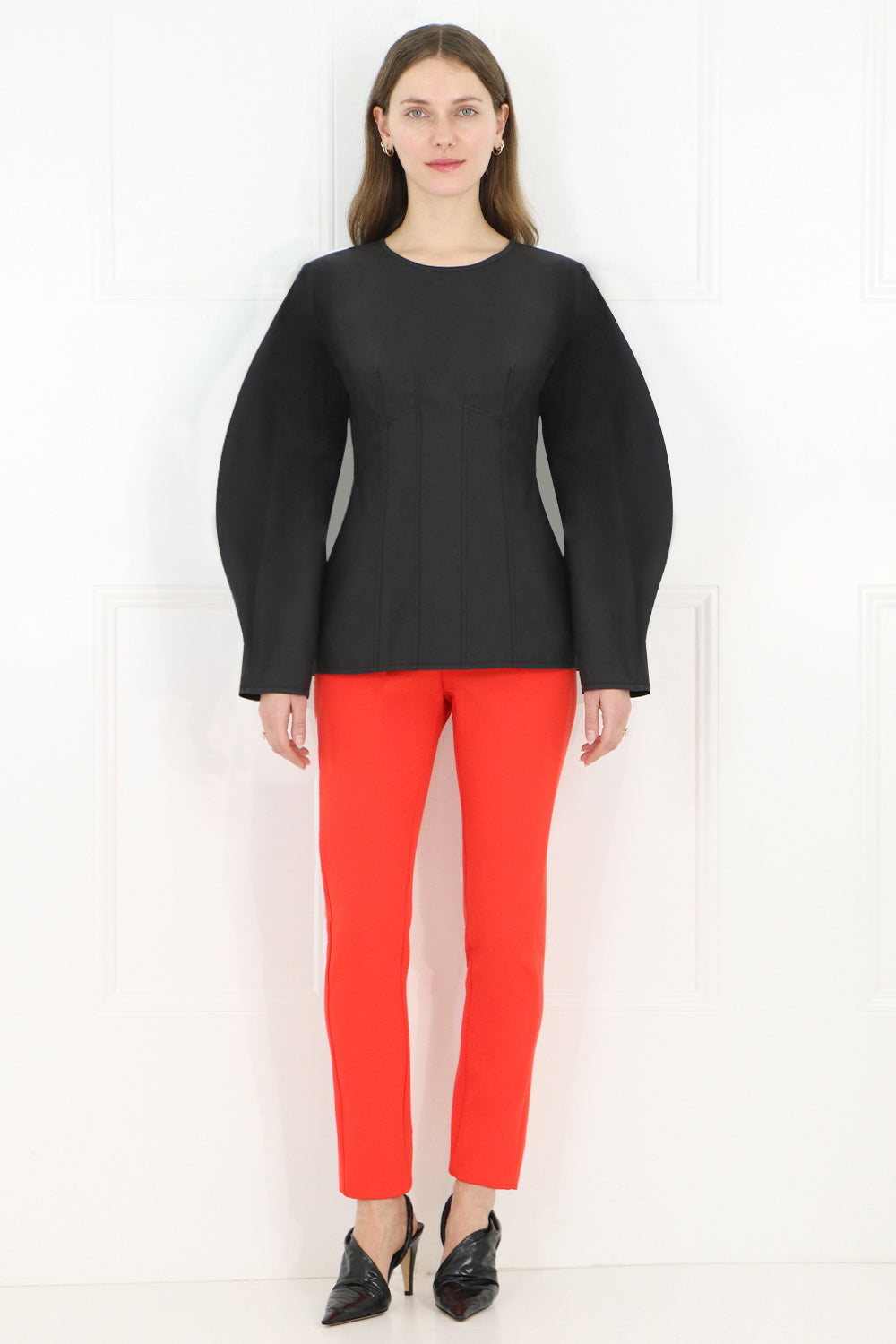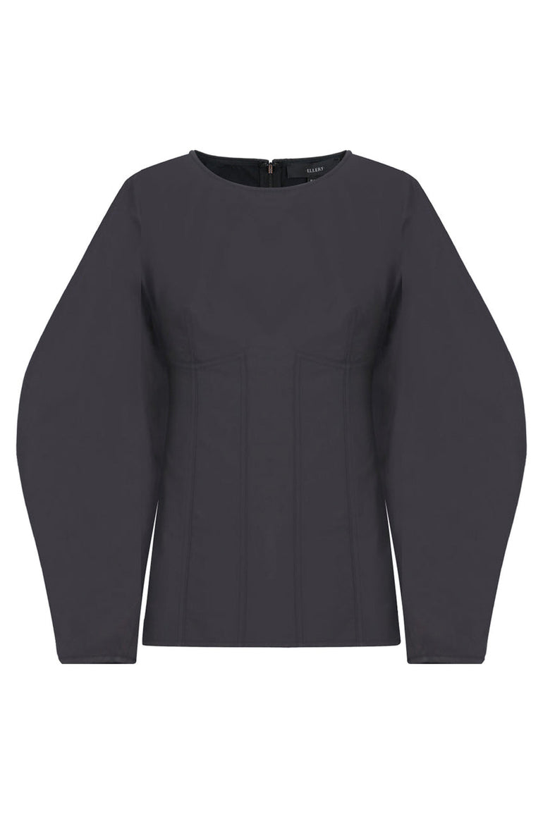 The Ellery Full Sleeve Top is a long sleeve structured top with corsetry detail. It is fitted at the waist and has a zipper opening at the back. It is crafted in a grey poplin fabrication.