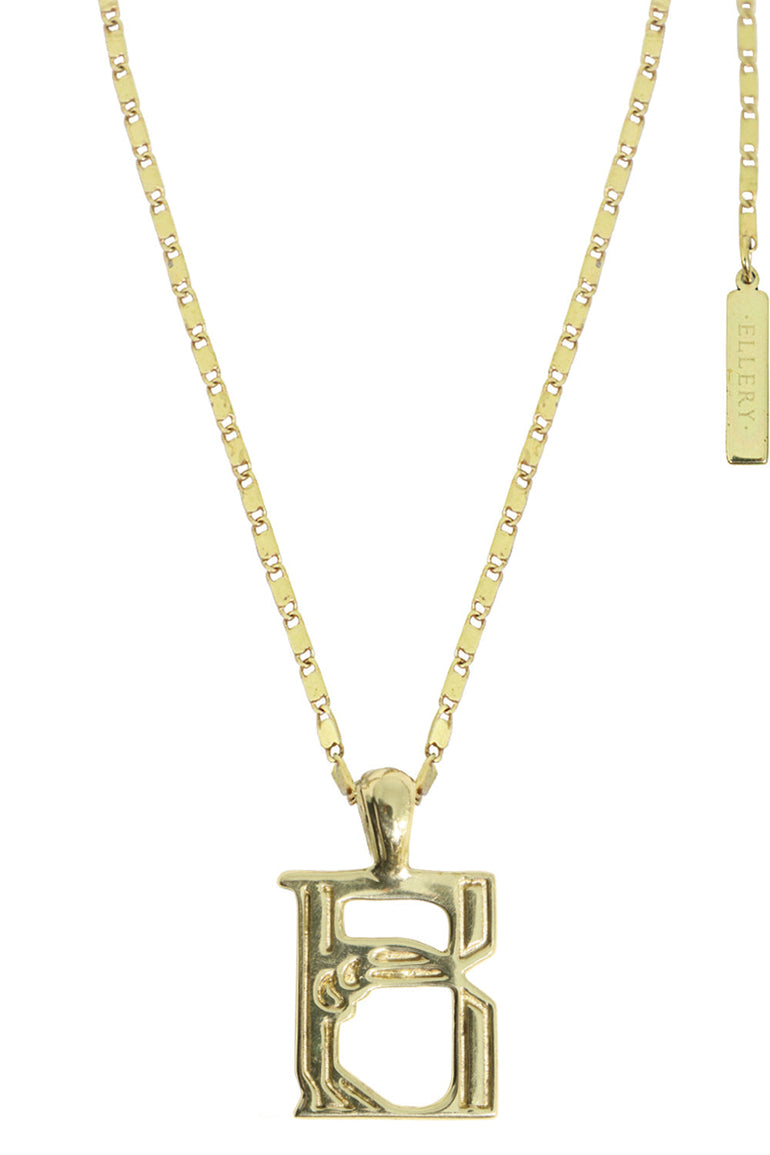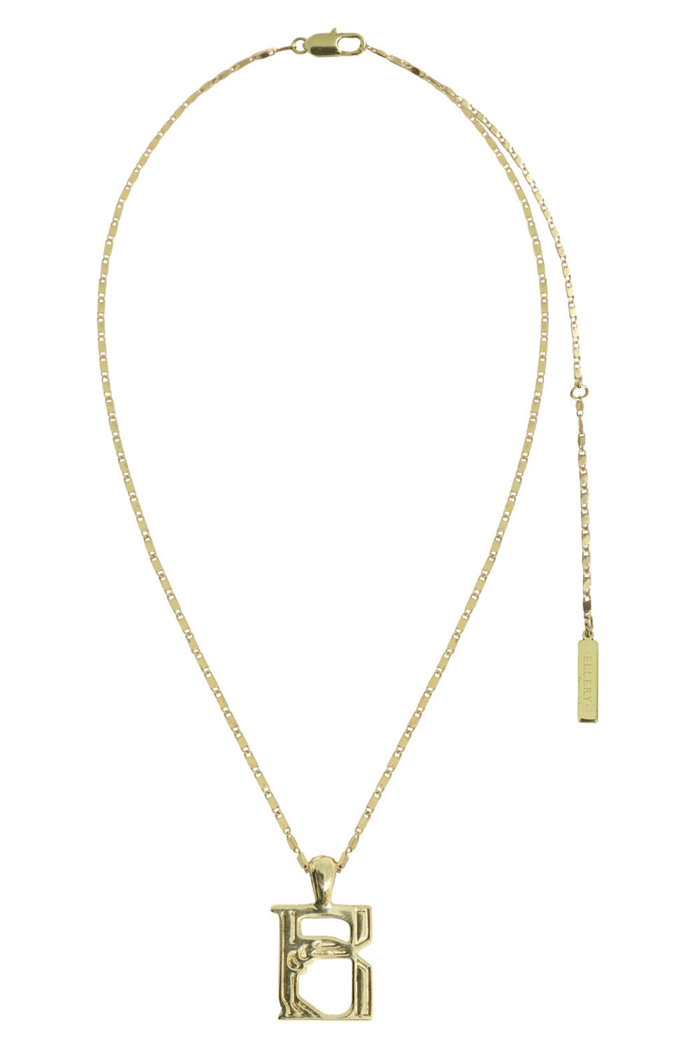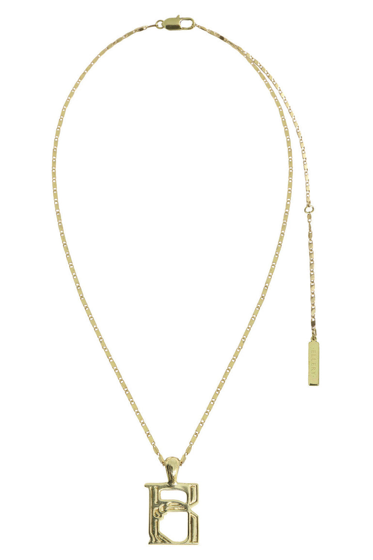 The Ellery Alphabet Charm Necklace features a charm with the letter 'B' with a lobster closure. It is crafted in gold brass with a nano plating. Nano plating is a fine ceramic plating that makes this product tarnish resistant and hypoallergenic.