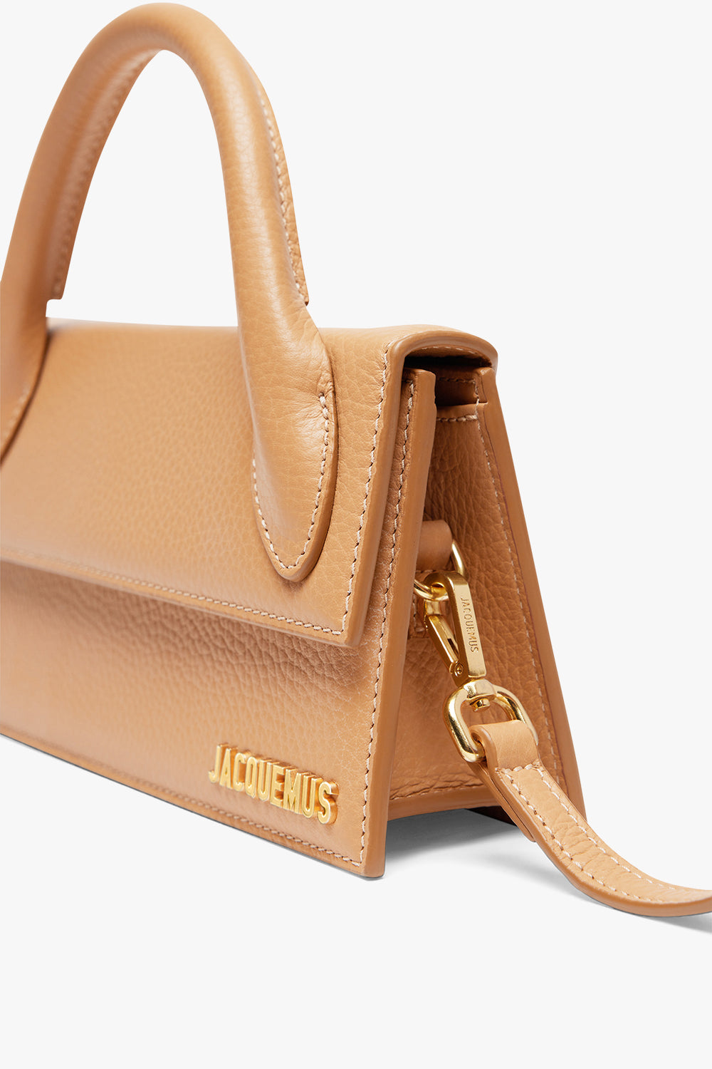 The Jacquemus Le Chiquito Long Leather Bag in Camel is crafted from calf nubuck leather, featuring a round top handle, a detachable and adjustable shoulder strap, a fold over top with magnetic closure and a main internal compartment and a gold-tone logo plaque.
