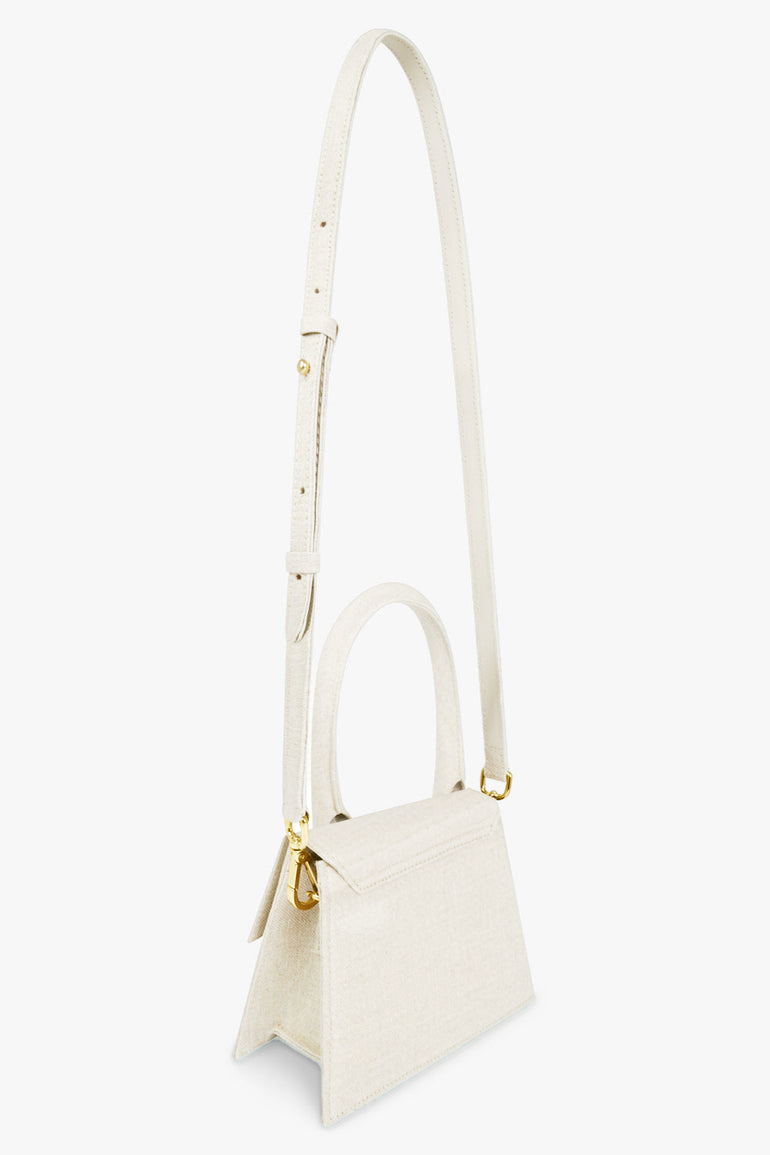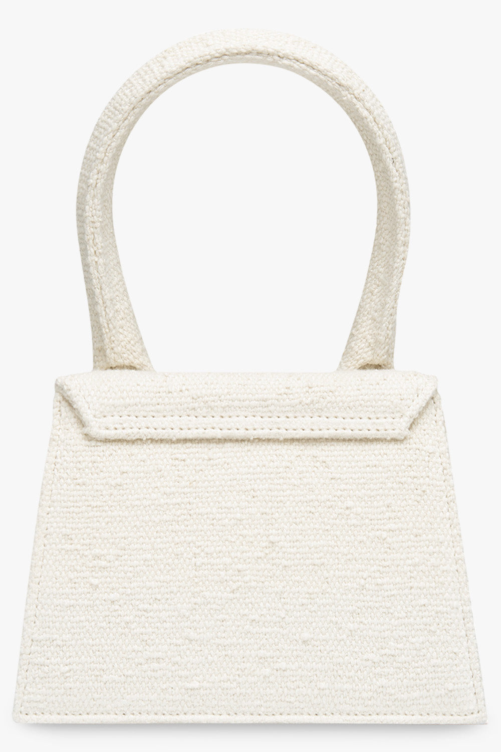 The Jacquemus Le Chiquito Moyen Bag in Off White features a round top handle, a detachable and adjustable shoulder strap, a fold over top with magnetic closure and a main internal compartment and a gold-tone logo plaque.