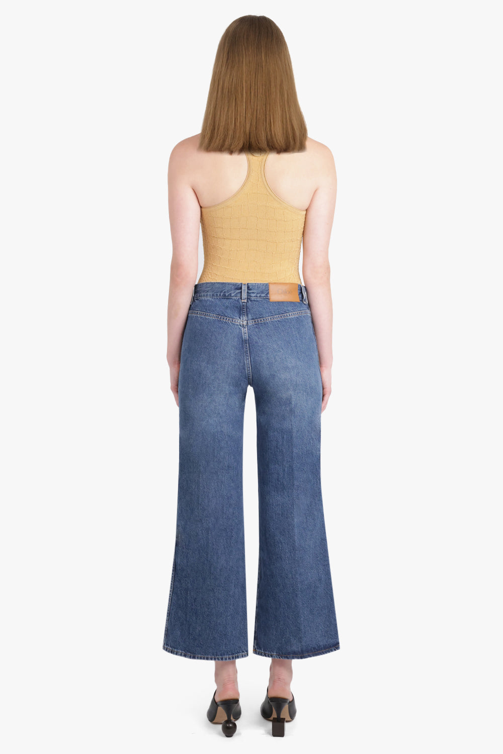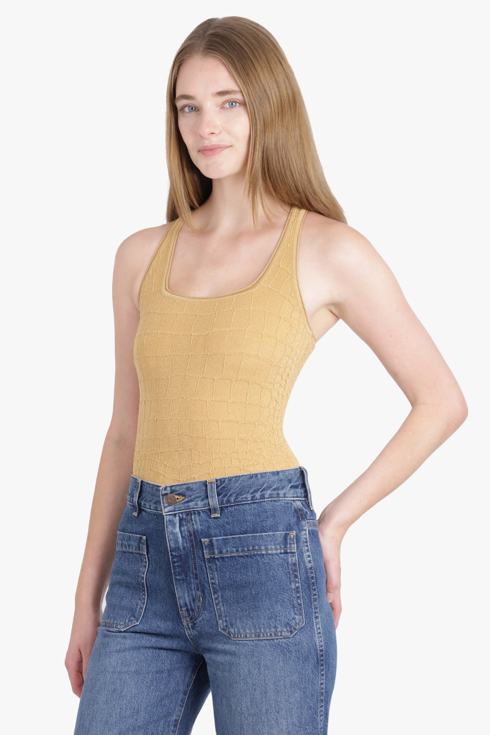 This fitted racerback tank-top is expertly crafted with crocodile embossed stretch viscose fabric, creating a sleek and comfortable design. The square neckline and "J" locker loop on the race-back add a stylish touch to this top.