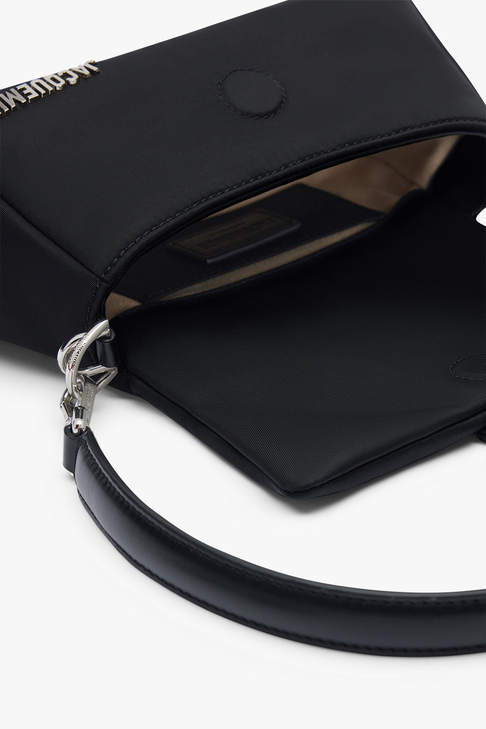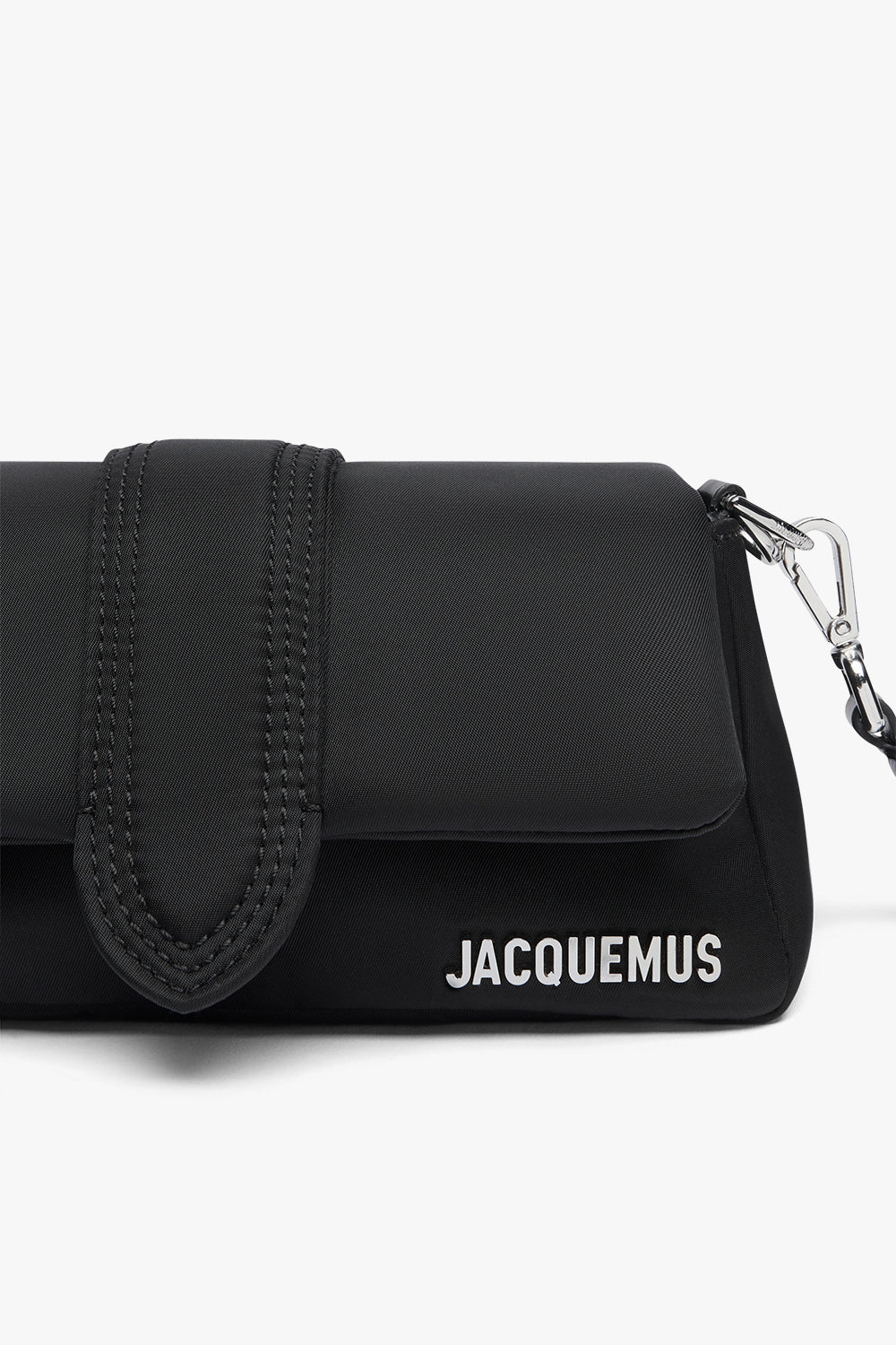 Le Petit Bambimou's Nylon model boasts a padded nylon body, magnetic flap closure, dual shoulder straps for shoulder or crossbody wear, engraved lobster clasp, back patch pocket, internal pocket, silver metal logo & hardware, cotton lining, and water-repellent seams welded with thermoplastic.