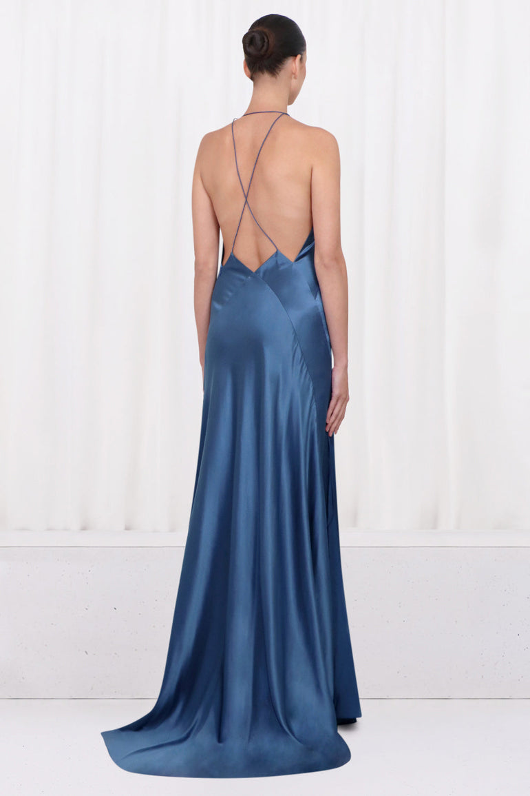 The Michael Lo Sordo Bone 007 Paloma Maxi Dress is crafted from a liquid silk satin in a denim blue colour, produced exclusively for Parlour X. This plunging and figure hugging style features a leg baring front slit and crossover spaghetti straps in the back with a zip closure on the side.