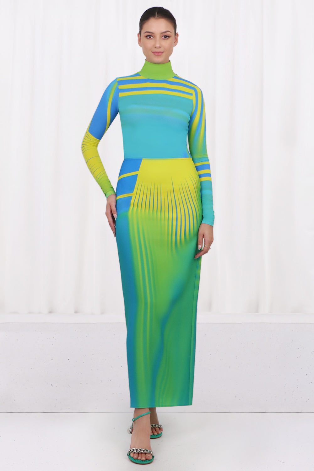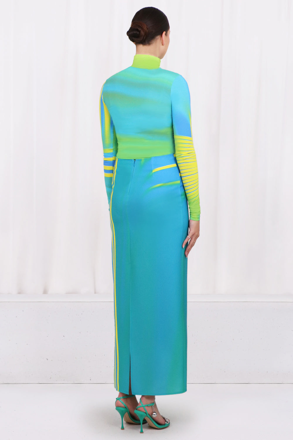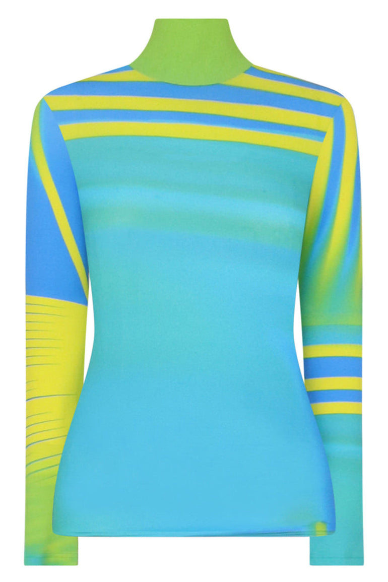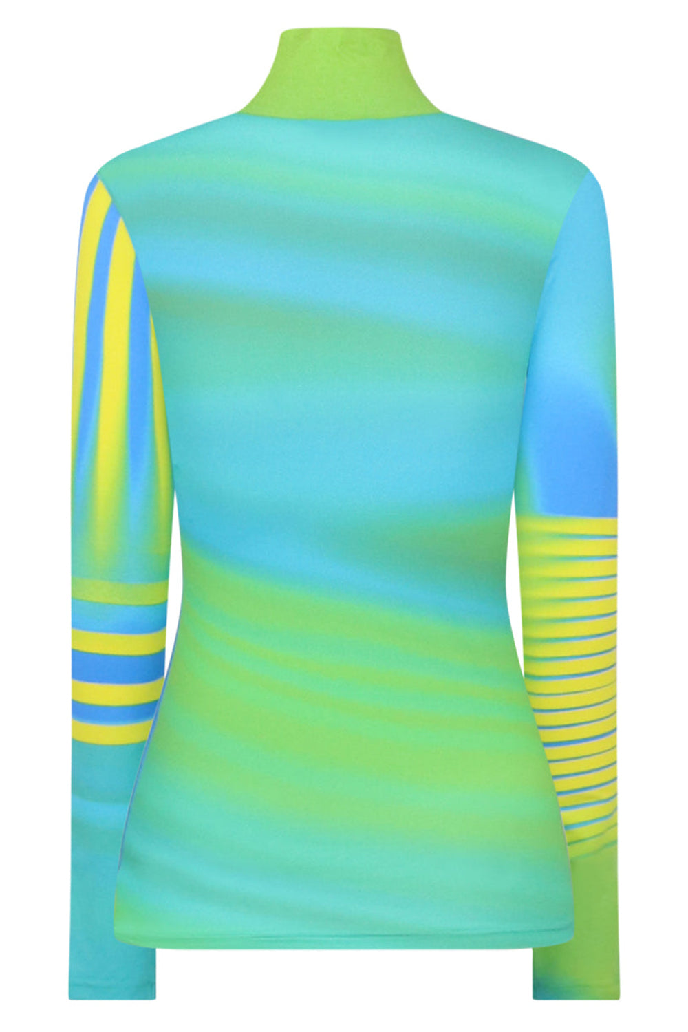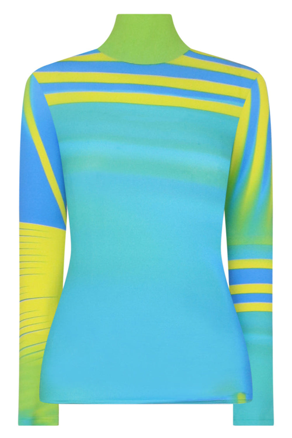 The Nina Ricci Second Skin L/S Shirt is crafted from a stretchy polyamide that features a blue, green and yellow abstract print. This style includes a turtleneck and elongated sleeves.
