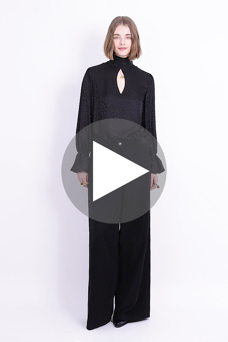 Expertly crafted with a luxurious silk blend fabric, this black white blouse features a striking leopard print jacquard design. The high neck and cut-out detailing add a unique touch, while the elasticated cuffs provide a comfortable fit. Complete with a rear tie fastening and a straight hem, this blouse showcases both style and functionality.