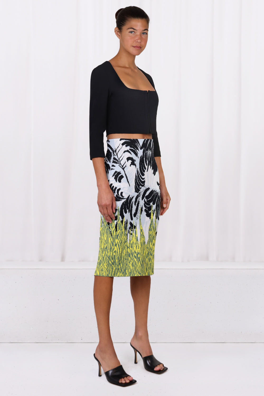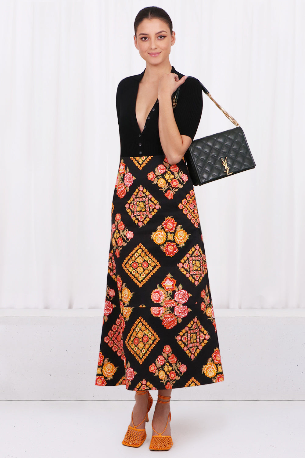 Draped Velvet Contrast Floral Print Midi Skirt | Black/Multi
