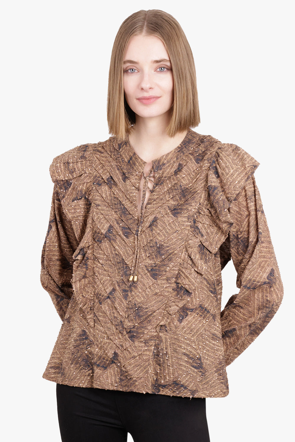 Layered L/S Shirt with Check Ruching Detail | Camel/White