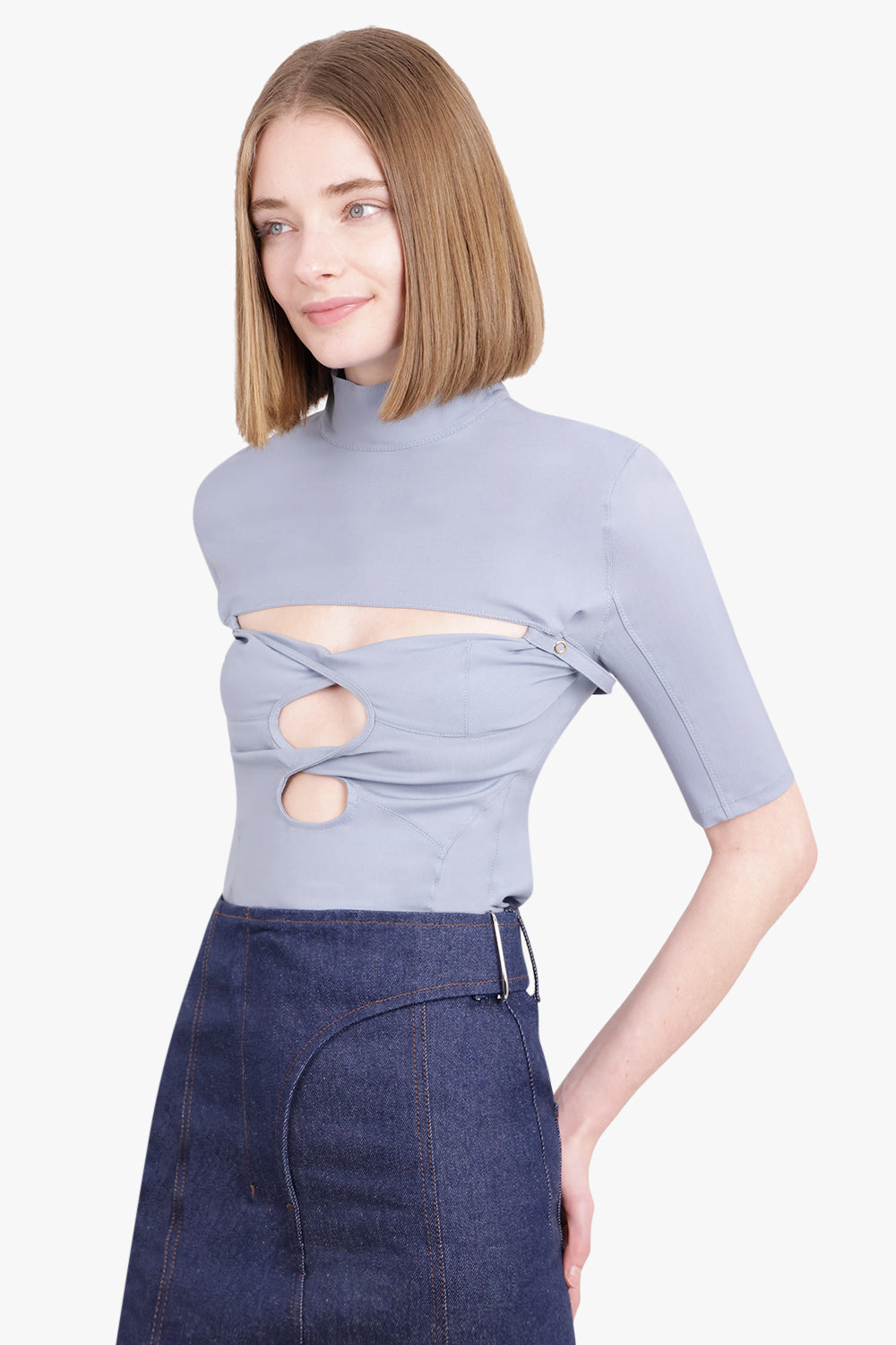 Backless Stripe S/S T-Shirt with Silver Motif | Blue/White