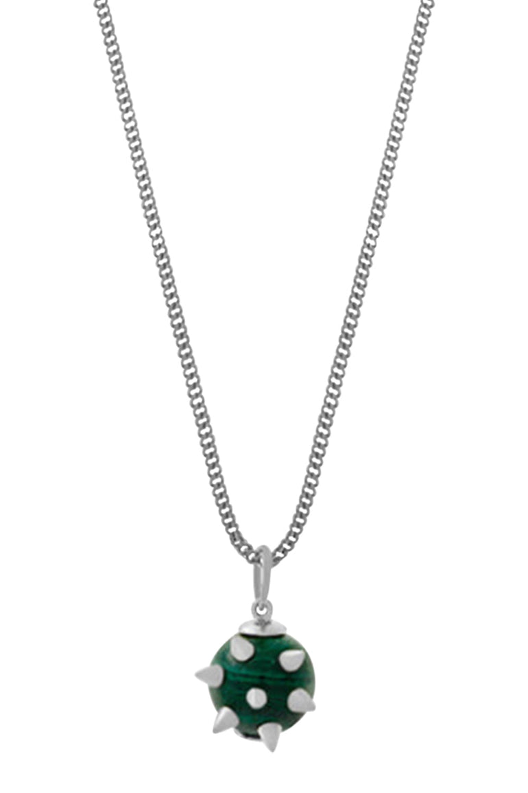 The Sener Besim Malachite Spike Necklace is crafted from Sterling Silver with Silver Rhodium coating, and features a round Malachite stone fendant with spike detailing and a cable chain with lobster clasp.