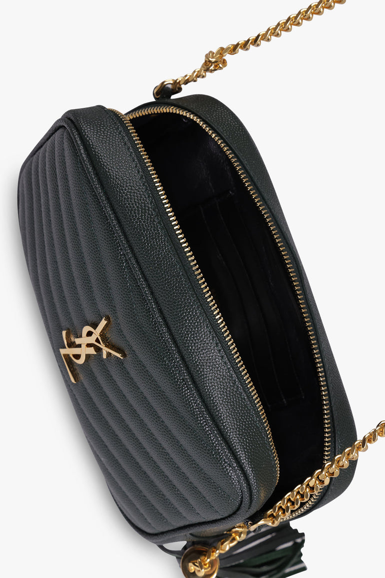 The Saint Laurent Lou Mini Quilted Camera Bag is a monogram shoulder bag featuring a gold chain strap, leather tassel zipper, interlaced YSL initials in metal at the centre and quilted overstitching.