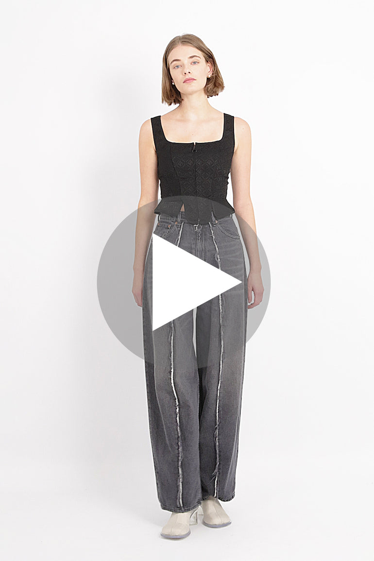 MM6’s black denim trousers are crafted from cotton denim with a wide leg and offset by a raw-edge central seam. The style is characterised by button closure and belt loops. The brand’s discreet yet distinct signature, a horizontal line of white stitches, is found on the back of the garment, along with the numeric signature jacron label.