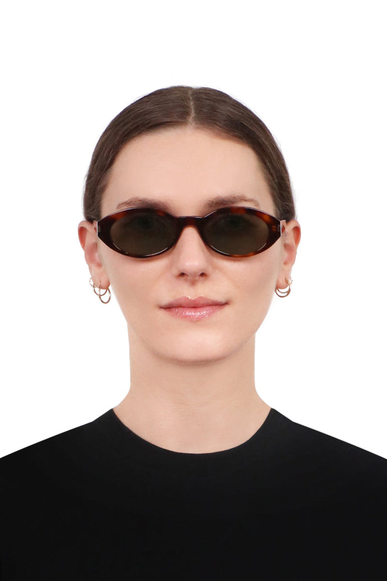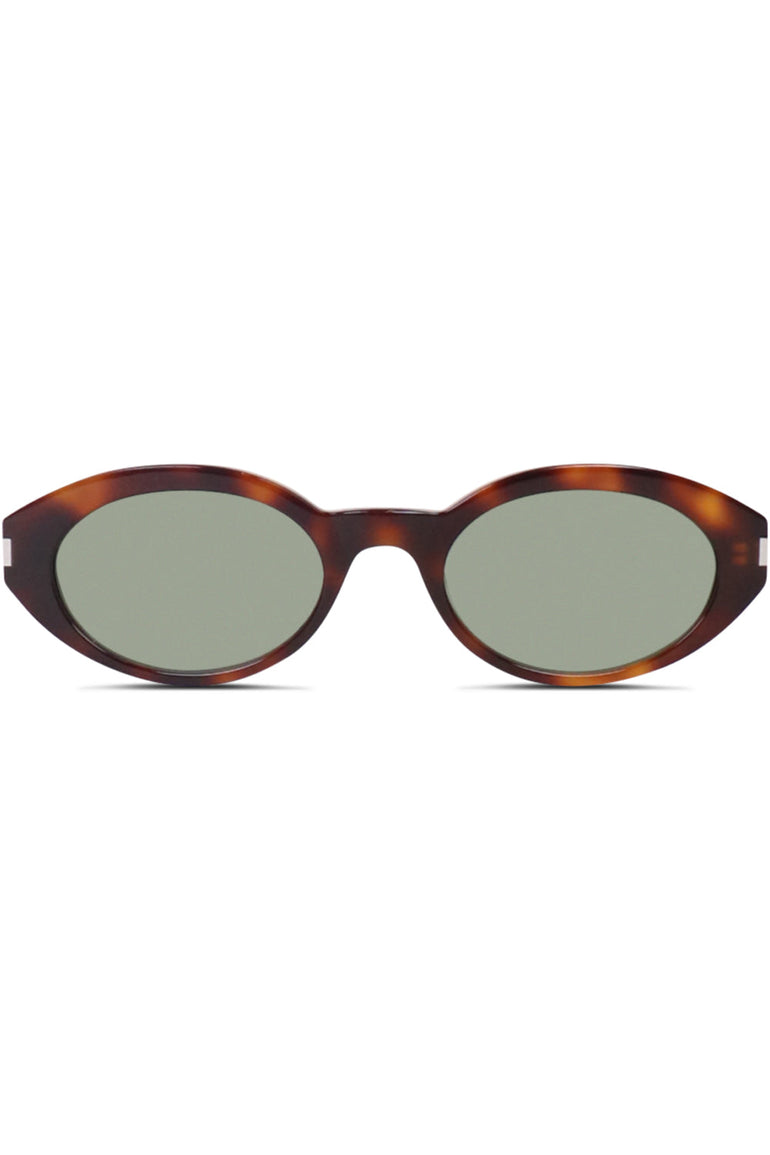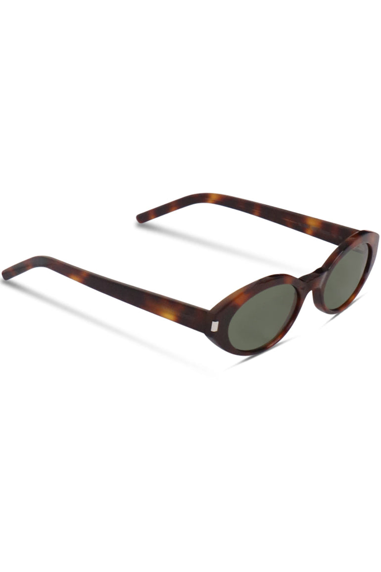 The Saint Laurent Acetate Nylon 567 Sunglasses are crafted from acetate and feature small, oval tortoiseshell frames, dark green lenses and thick arms with a tonal logo on the temples.