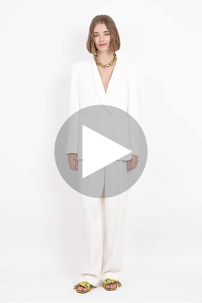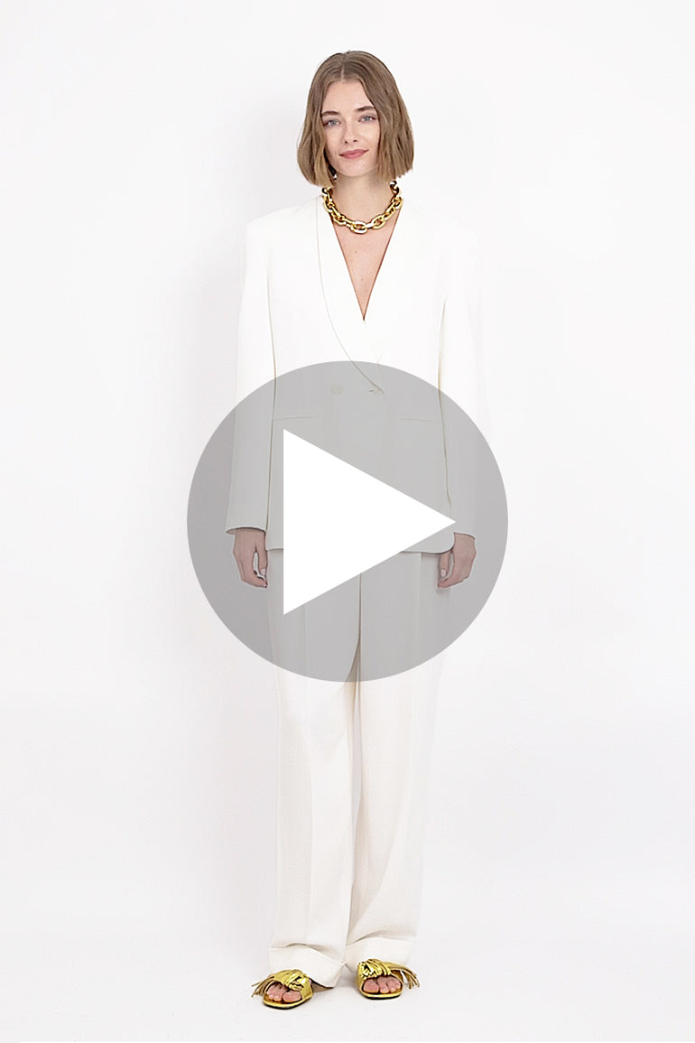 Double-breasted relaxed jacket in lightweight viscose cady with elongated silhouette, besom pockets, and horn button closure.