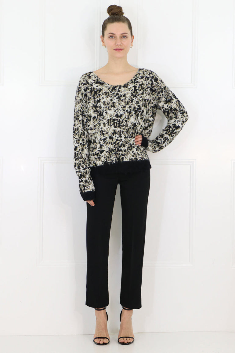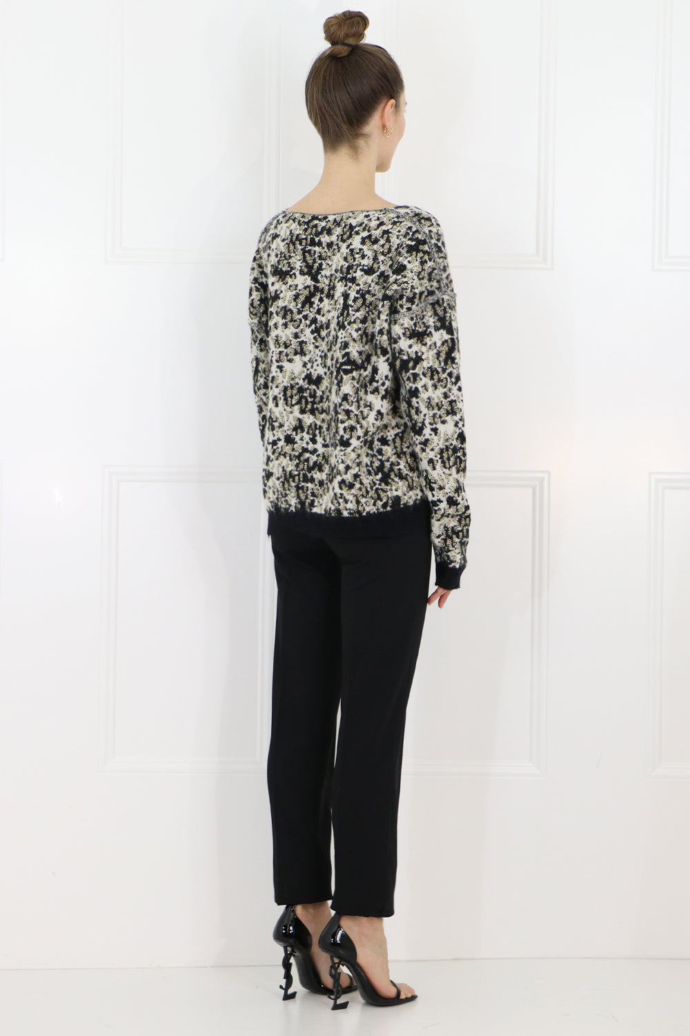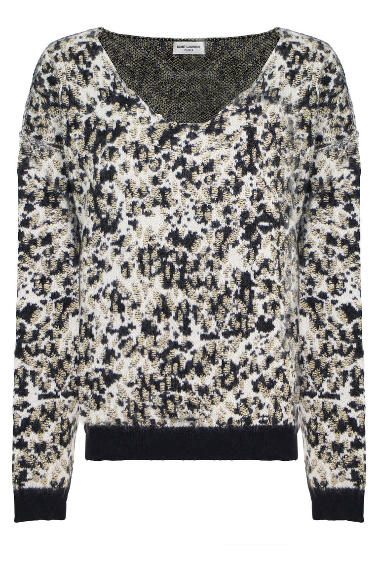 The Saint Laurent Animal Print Sweater is a long-sleeved sweater with scoop neckline crafted in a wool blend with gold metallic yarn.