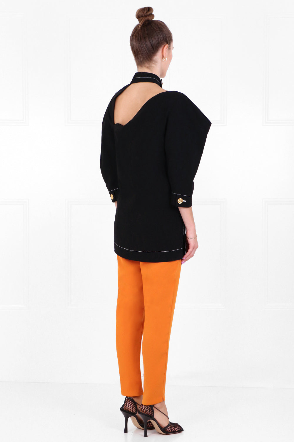The Proenza Schouler Asymmetric Cutout Blouse in black is crafted in lightweight textured crepe with contrast white topstitching. The blouse features an asymmetrical cut-out at the front and back neck, hammered gold-tone metal buttons which are custom developed for Proenza Schouler at the neck strap, side seams and cuffs and 3/4 puff sleeves.