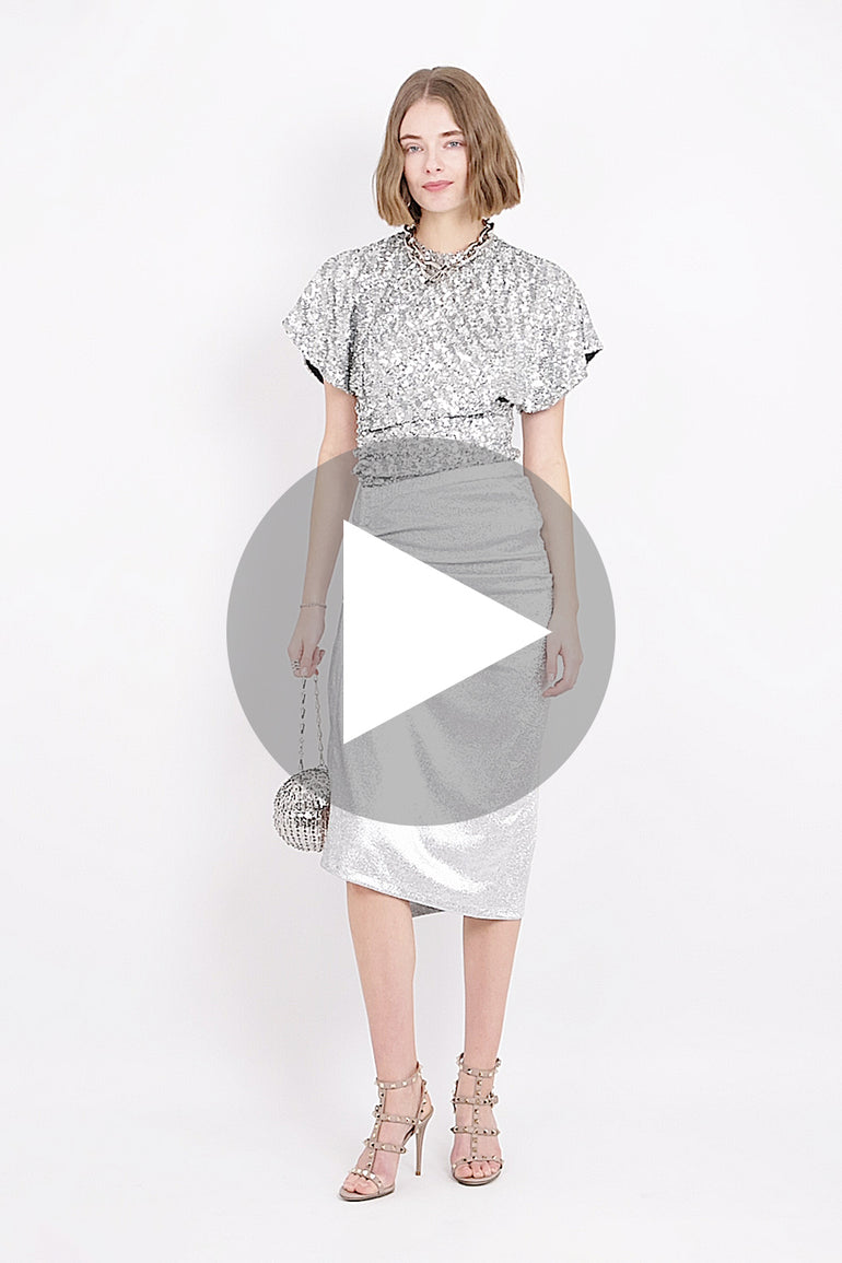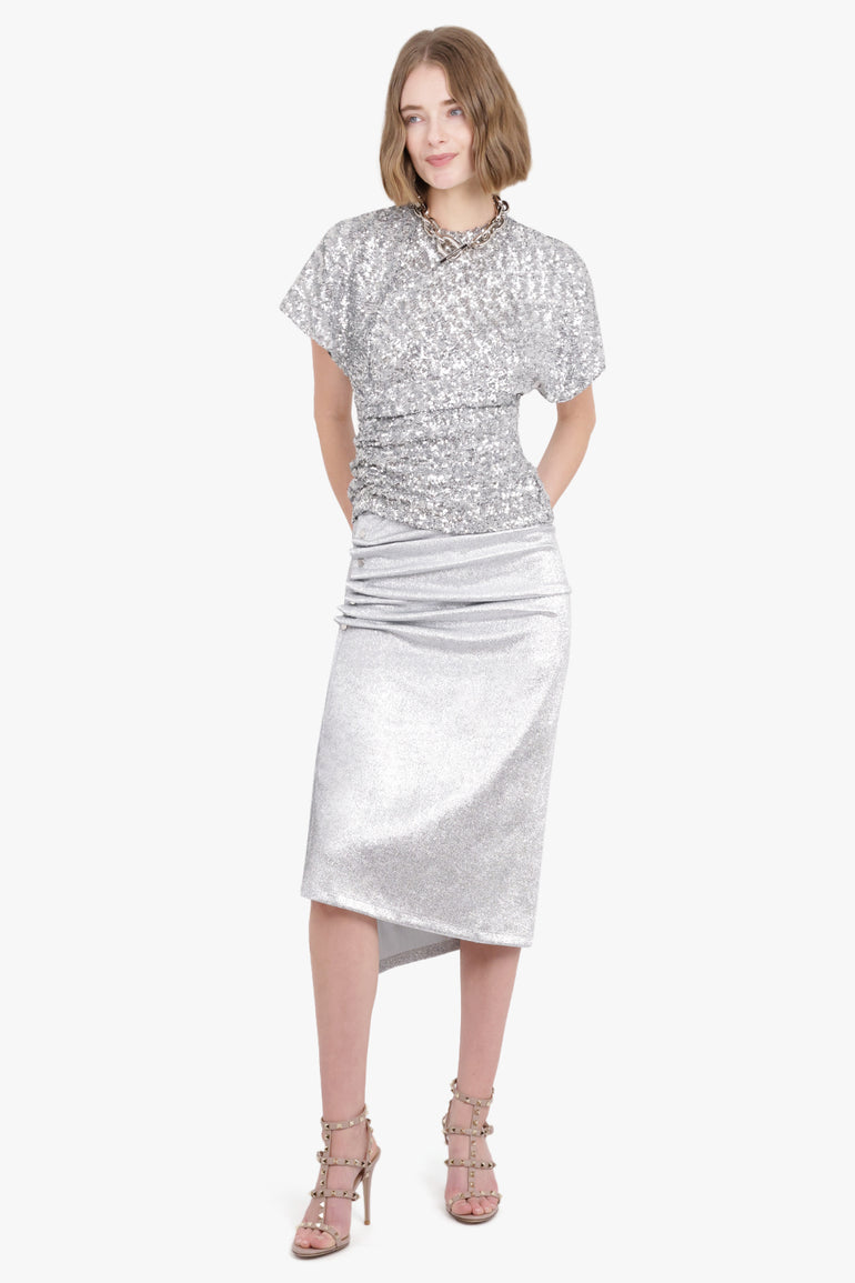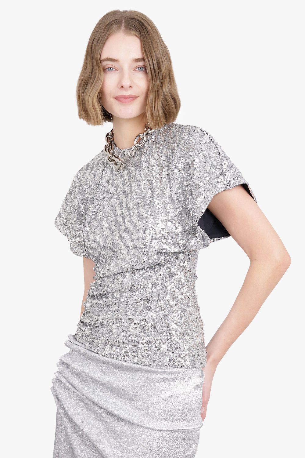 RABANNE RTW ASYMMETRIC RUCHED DETAIL SEQUIN TOP | SILVER