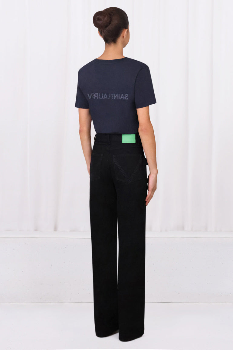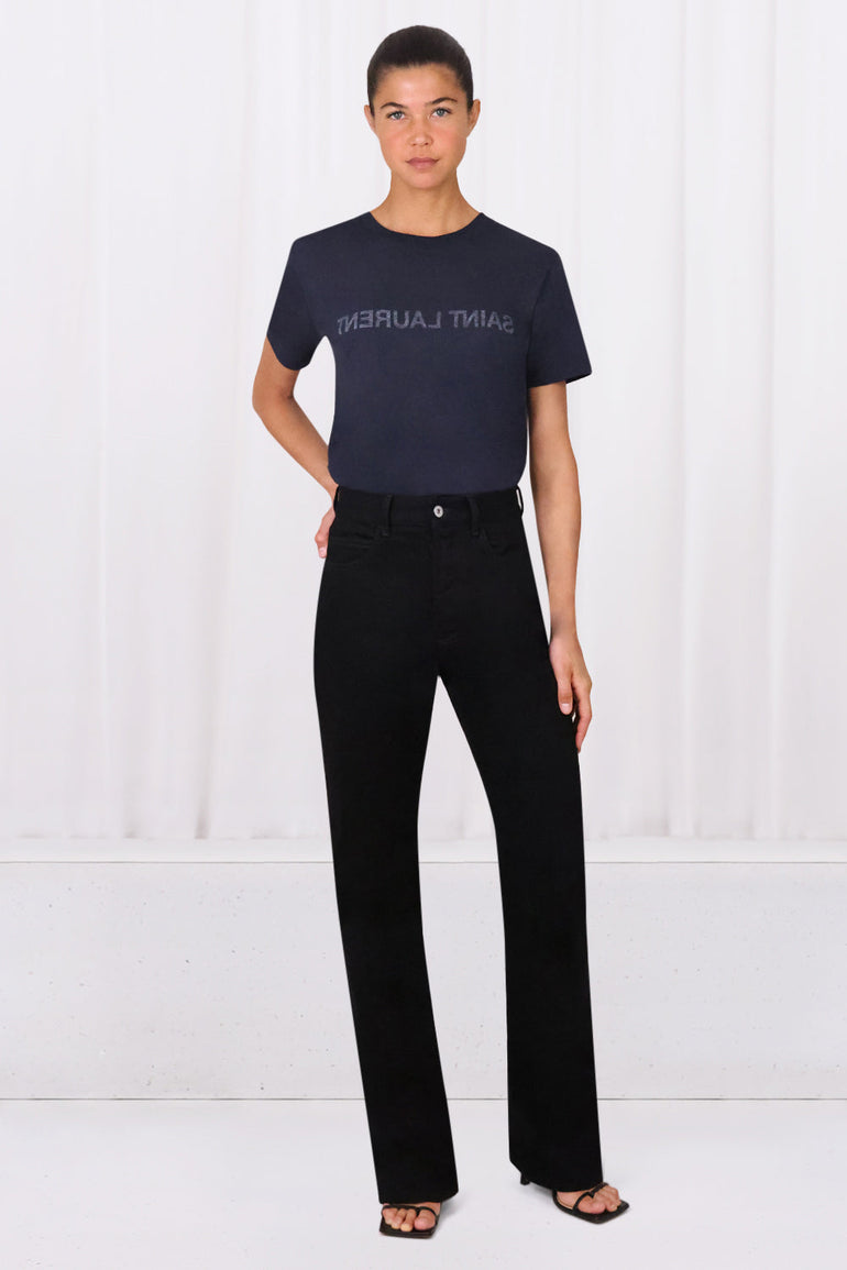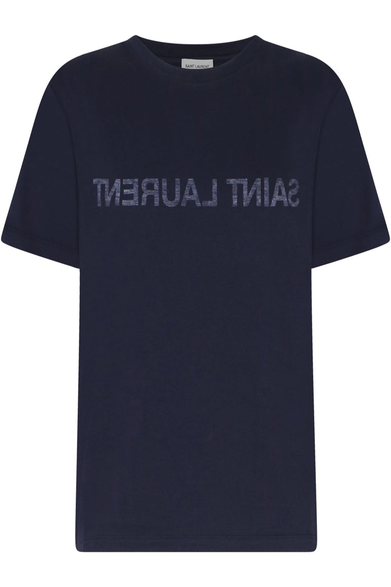 The Saint Laurent Backwards Logo T-Shirt is crafted from a cotton fabrication featuring a reverse printed Saint Laurent logo on the front and back. This t-shirt features a round neck, short sleeves and raw edges.