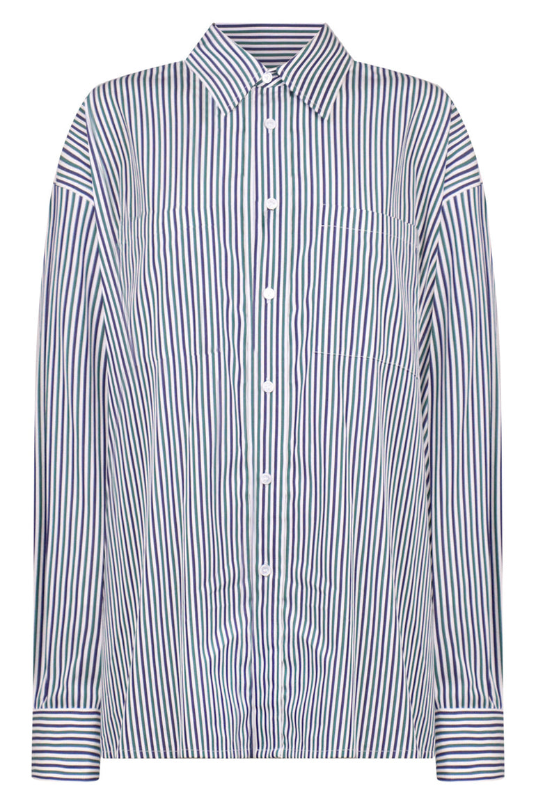 The Bottega Veneta Bi-Colour Stripe Shirt in White/ Navy/ Green is an ode to classic tailoring. With an oversized fit, this shirt is crafted from a cotton poplin with front button closure.