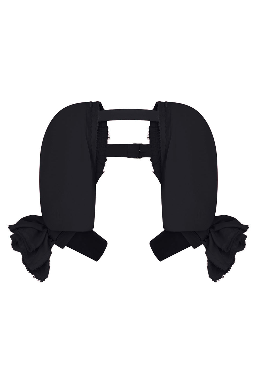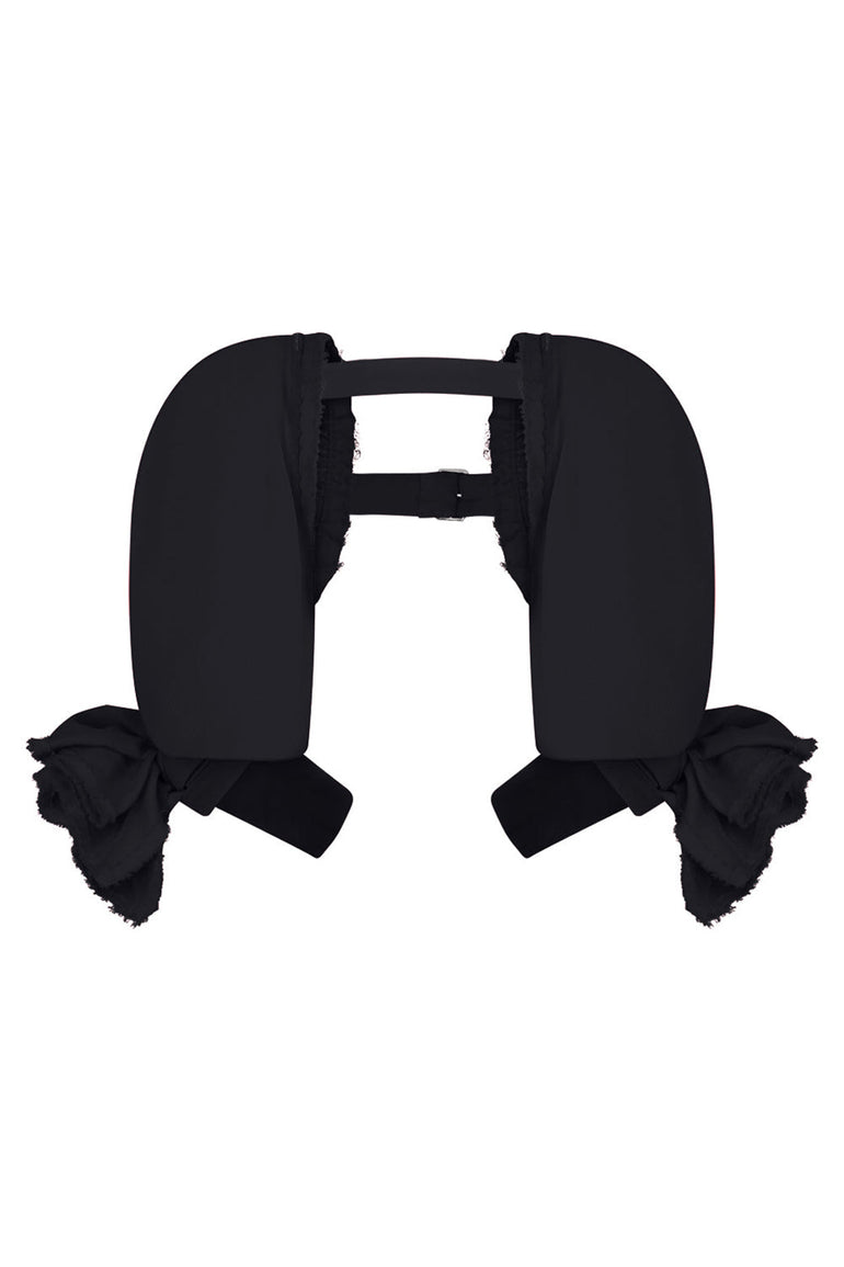 The Comme Des Garcons Bow Sleeve Cape in Black is crafted from Polyester serge, this style features exaggerated bow sleeves and buckle strap.