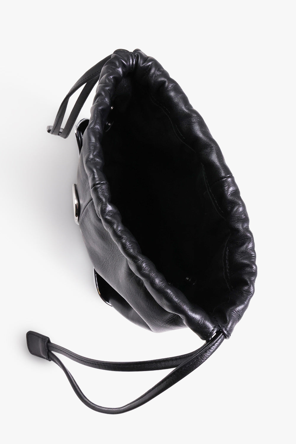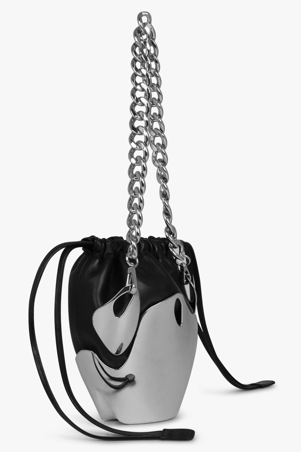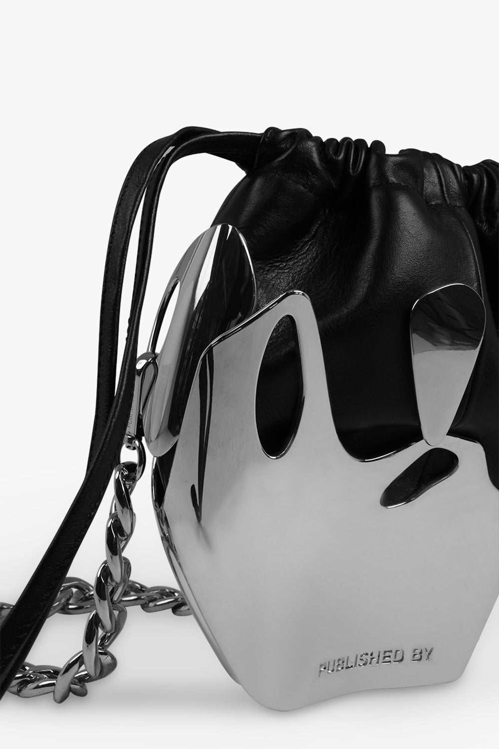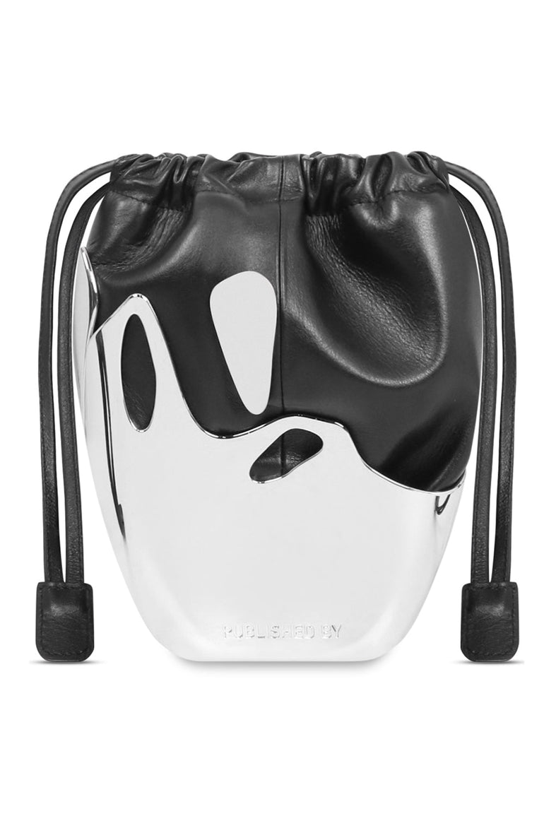 The Published By Bucket Bag is crafted from metal and nappa cow leather, and features organic chrome detailing, a drawstring closure at the top & a choice of two removable chain straps.