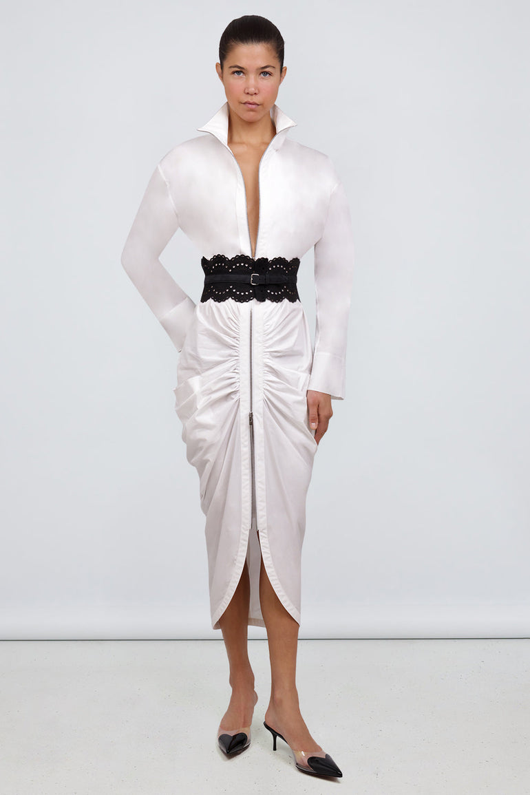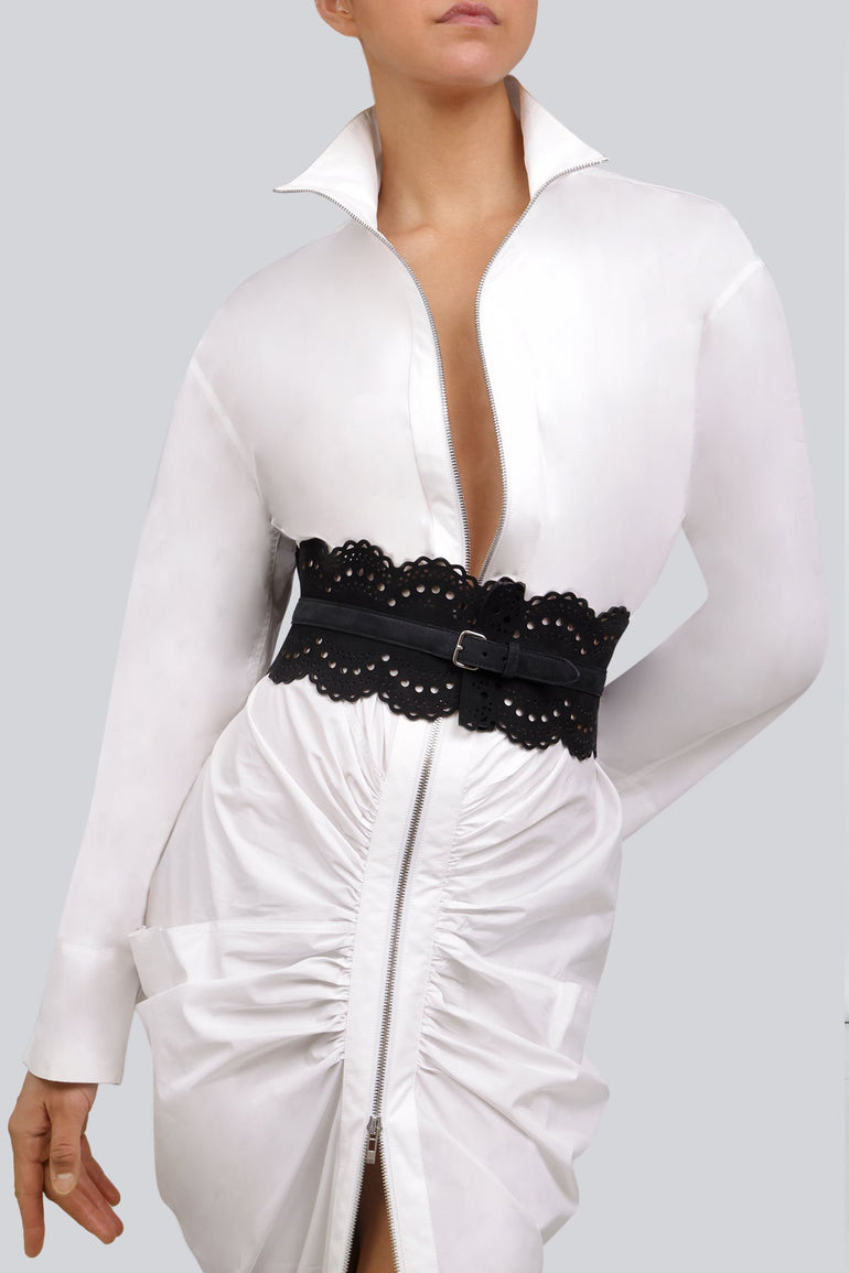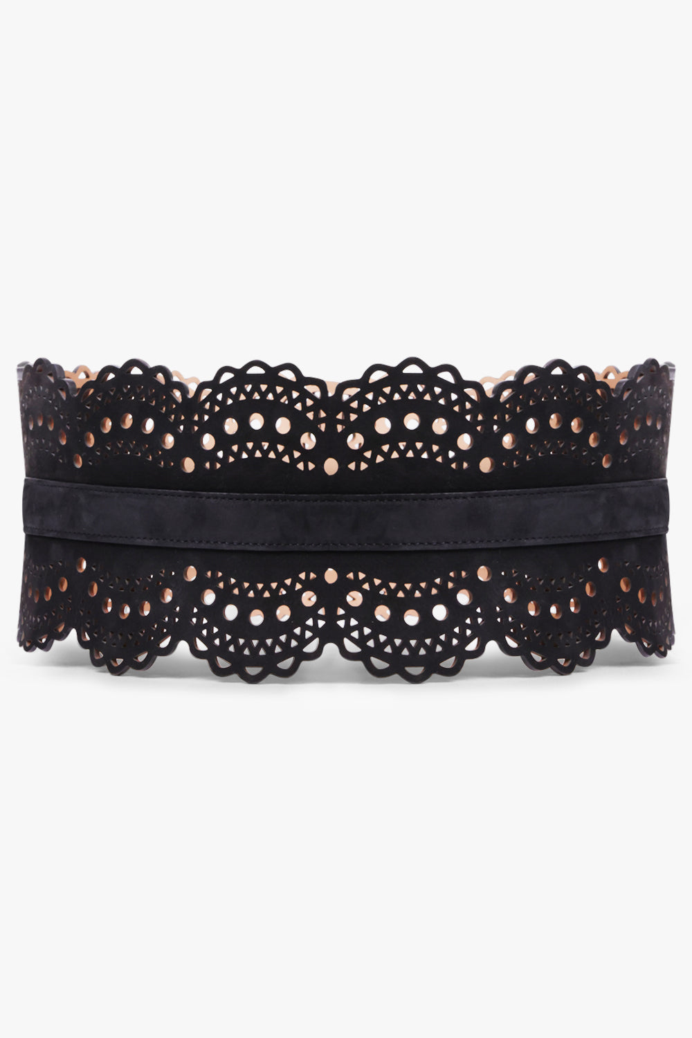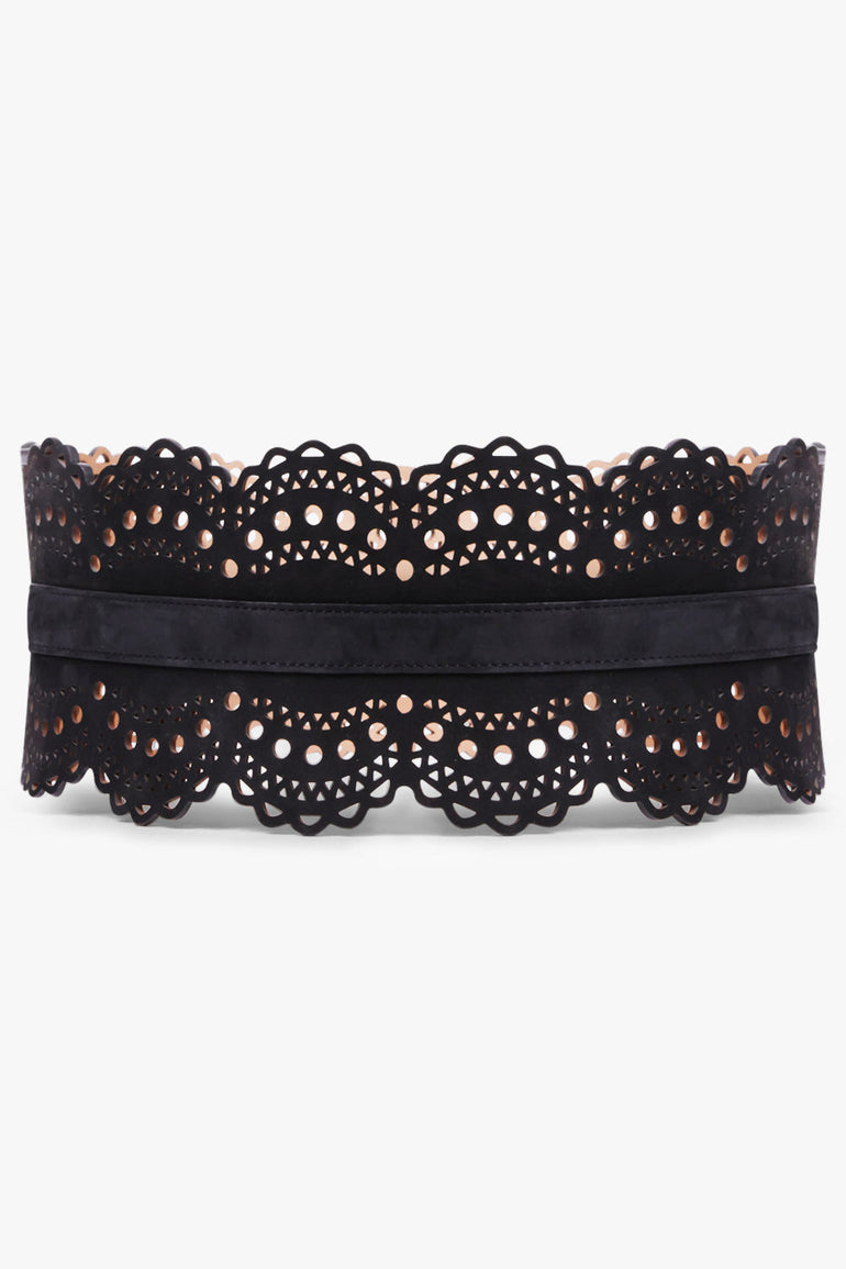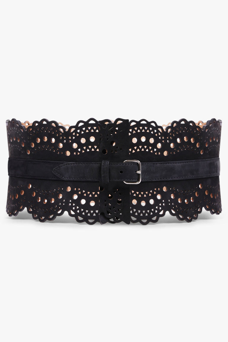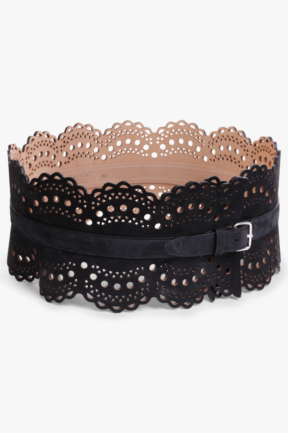The Alaïa Bustier Belt 120 is crafted from leather and is an iconic signature of the house. This style features one central buckle and all over cut outs inspired by lace. Openwork bustier belt, vienne pattern inspired by precious lace and moucharabieh architectural openwork, scalloped edges with thin buckle.