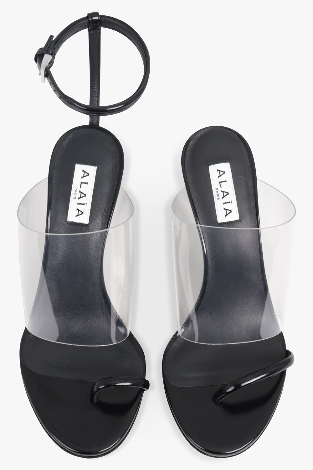 The Alaïa Clear Strap 90mm sandal features an asymmetrical heel, delicate leather straps, and transparent plexi details, crafted in soft calfskin for a sleek, modern look that’s both elegant and wearable.