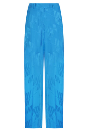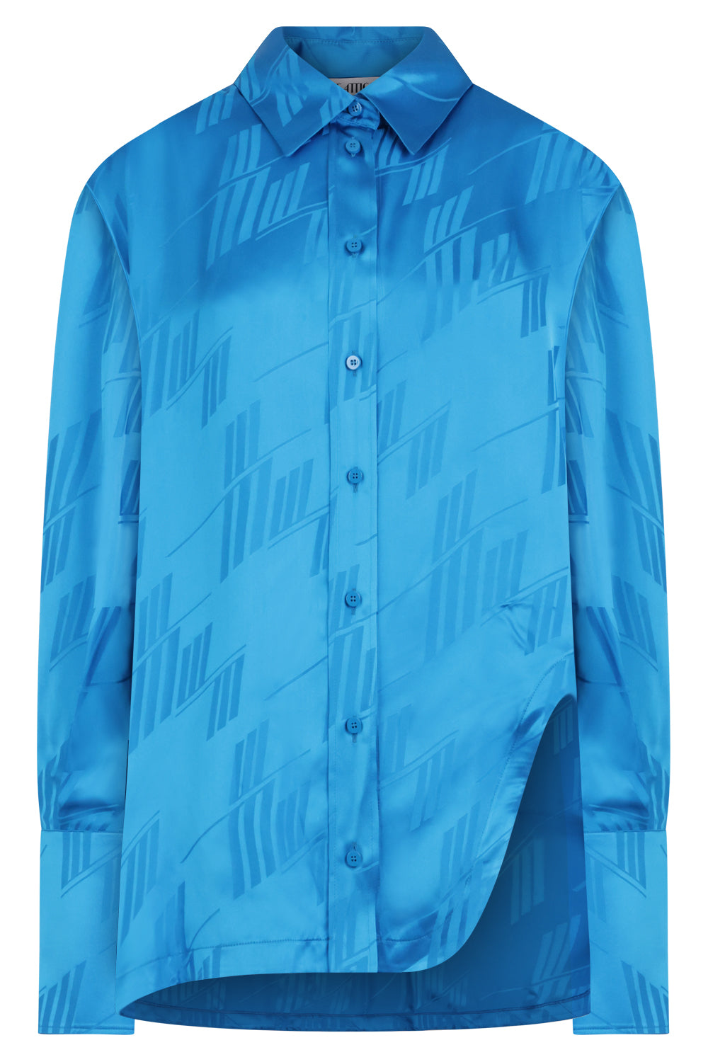 Diana' Shirt In Capri Blue Fluid Pied De Poule Logo. Features a front closure with buttons, a point collar with two button cuffs. All-over tone-on-tone jacquard logo. Asymmetrical hem with shaped slit on the front.