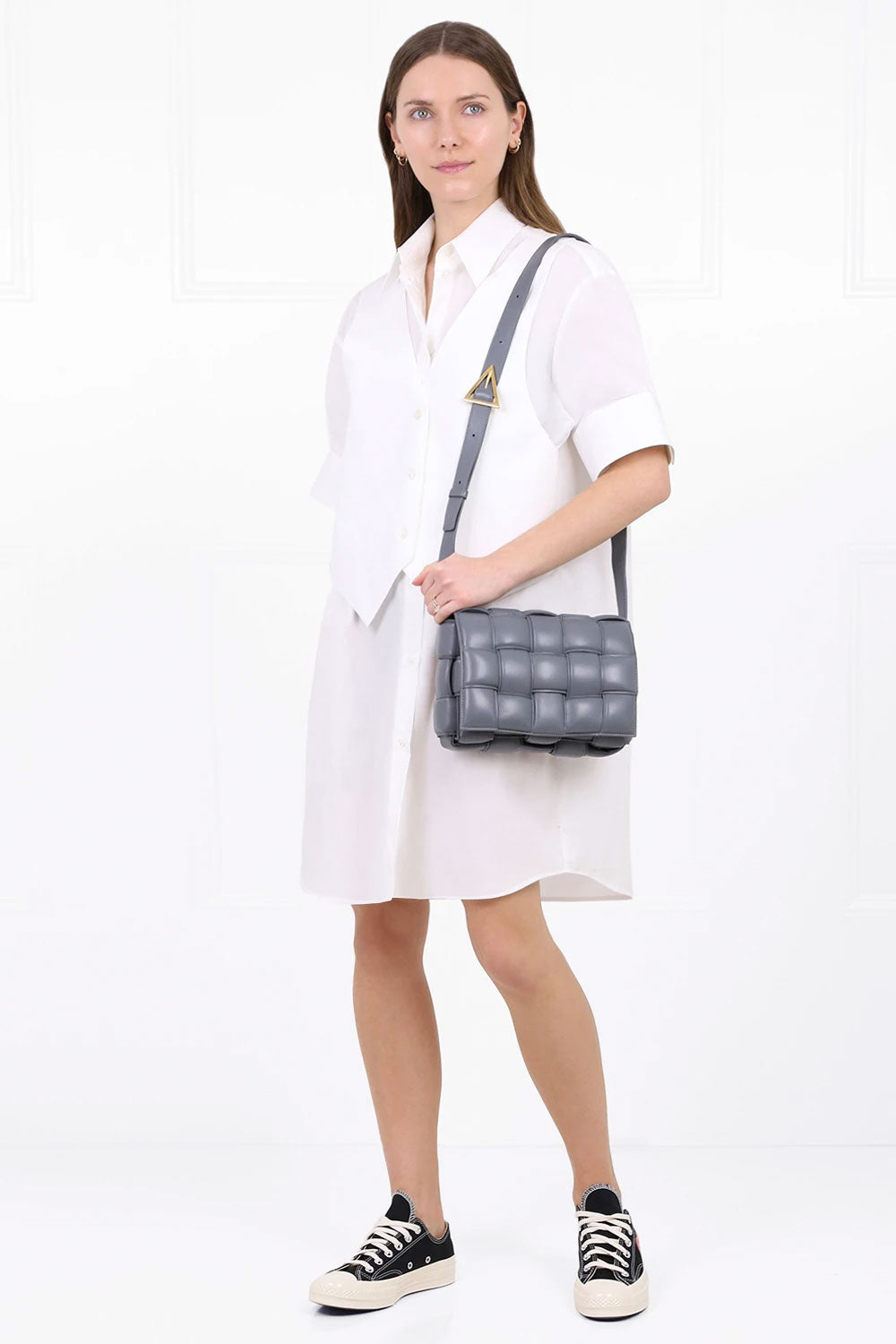 The MM6 Double Layer Shirt Dress is a short sleeve shirt dress comprising of two attached layers. It features a classic pointed collar, two front button plackets, short sleeves and a straight hem.