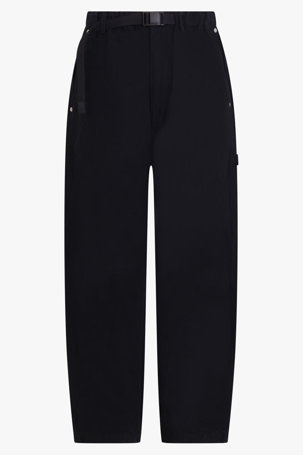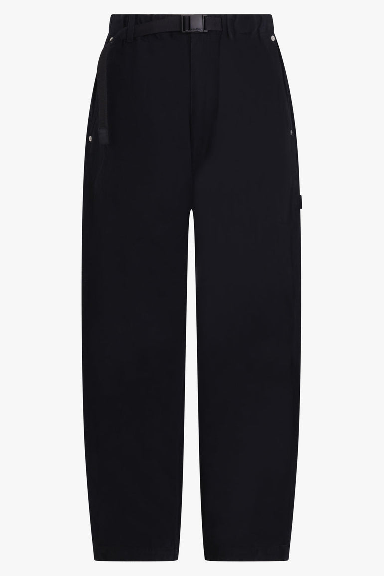 Dyed Oxford pant from COMME DES GARÇONS HOMME PLUS featuring black, drop crotch, high waist, straight frame, belt loops, plastic belt and buckle and zip fastening, two side inset pockets, and rear pocket.