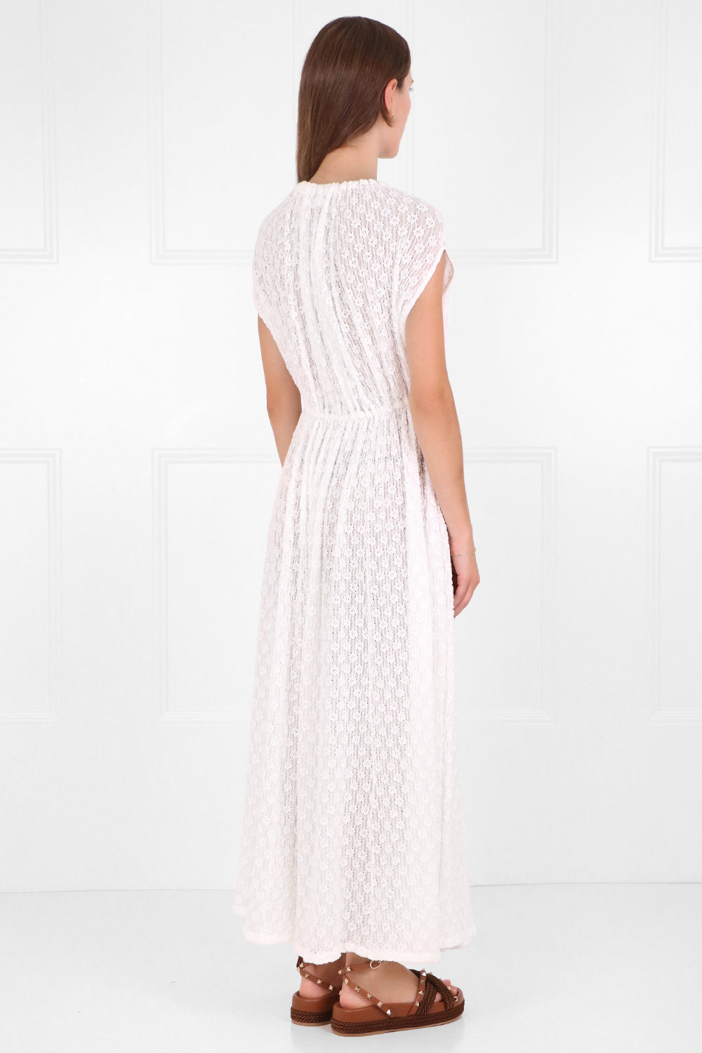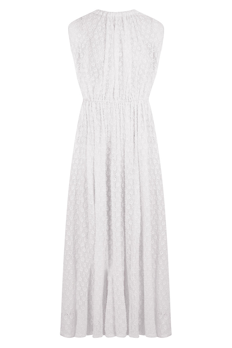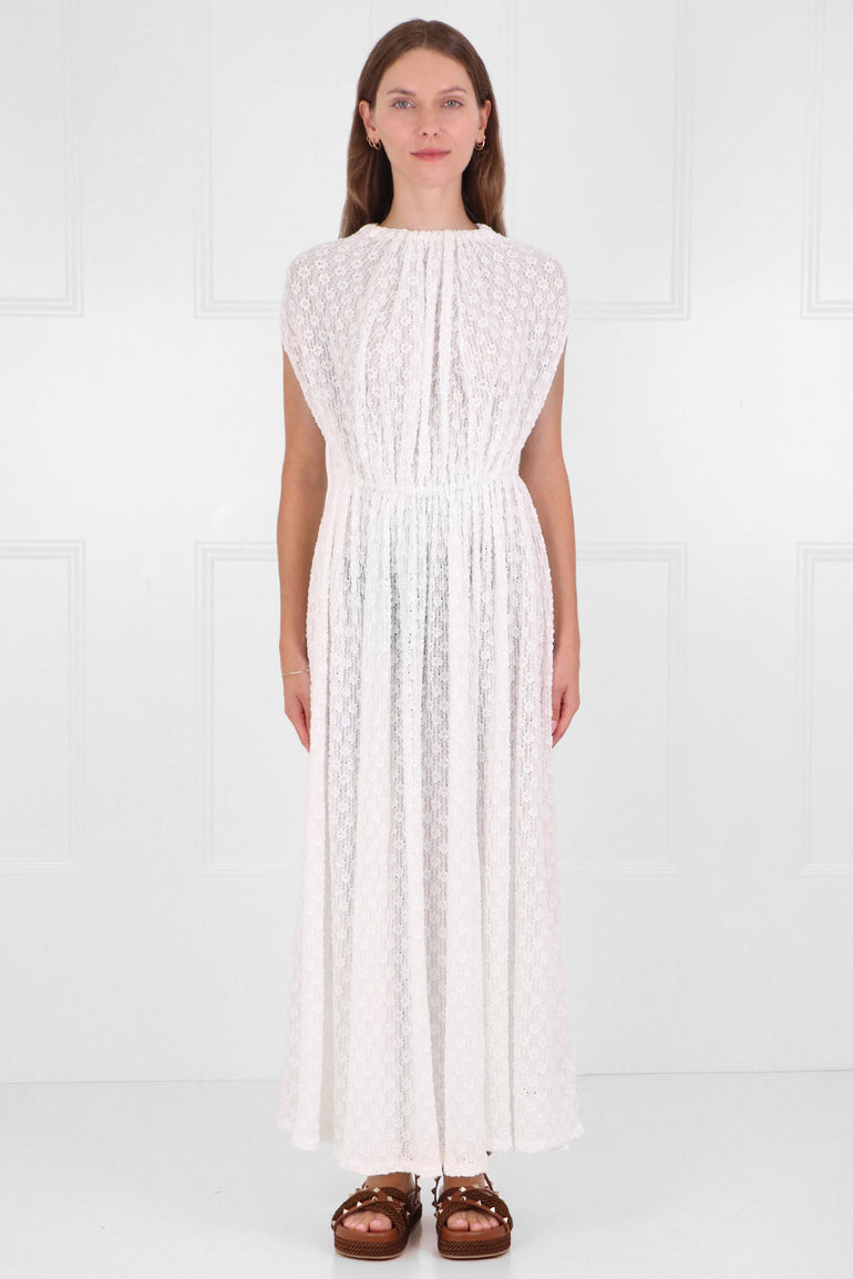 The Embroidered Lace Dress in white is crafted from a polyamide, cotton blend fabric accented by cloqué-effect daisies. The pull-over designed cap-sleeve maxi dress features a gathered round neckline, a cinched elasticated hem and a full skirt