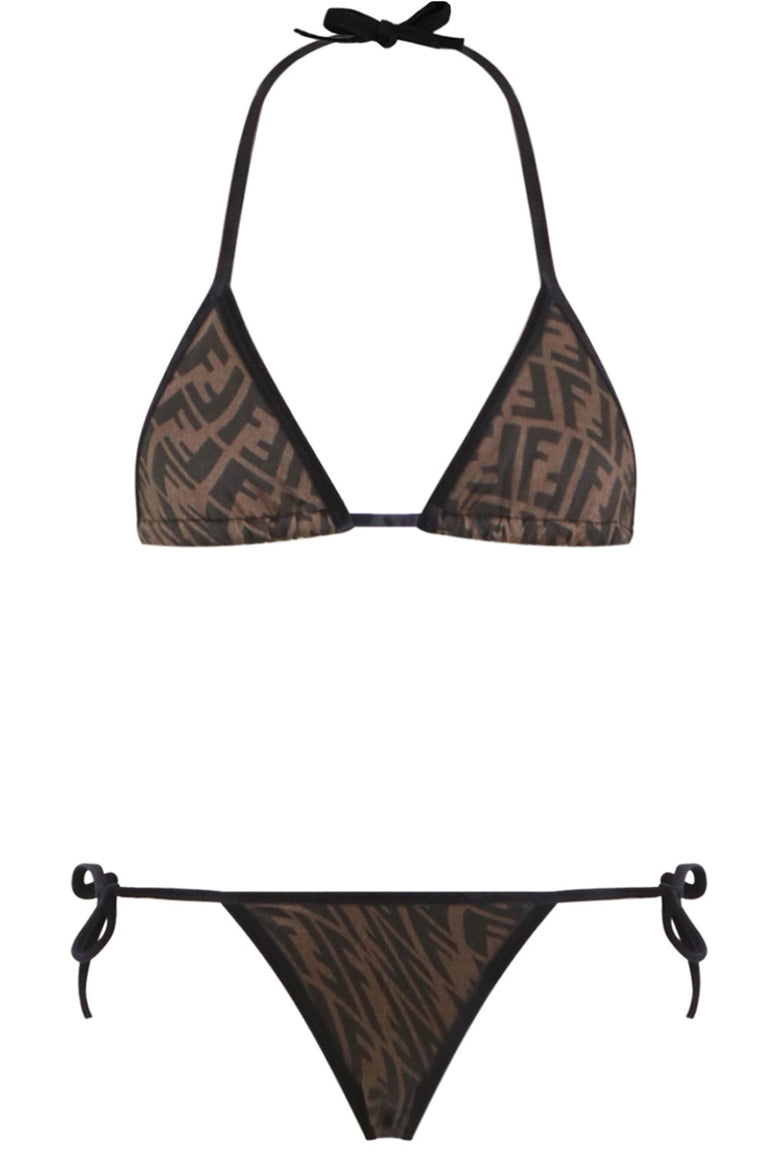 The Fendi FF Vertigo Bikini in tobacco features a triangle top with neck and back ties and side tied briefs, featuring a FF vertigo pattern print.
