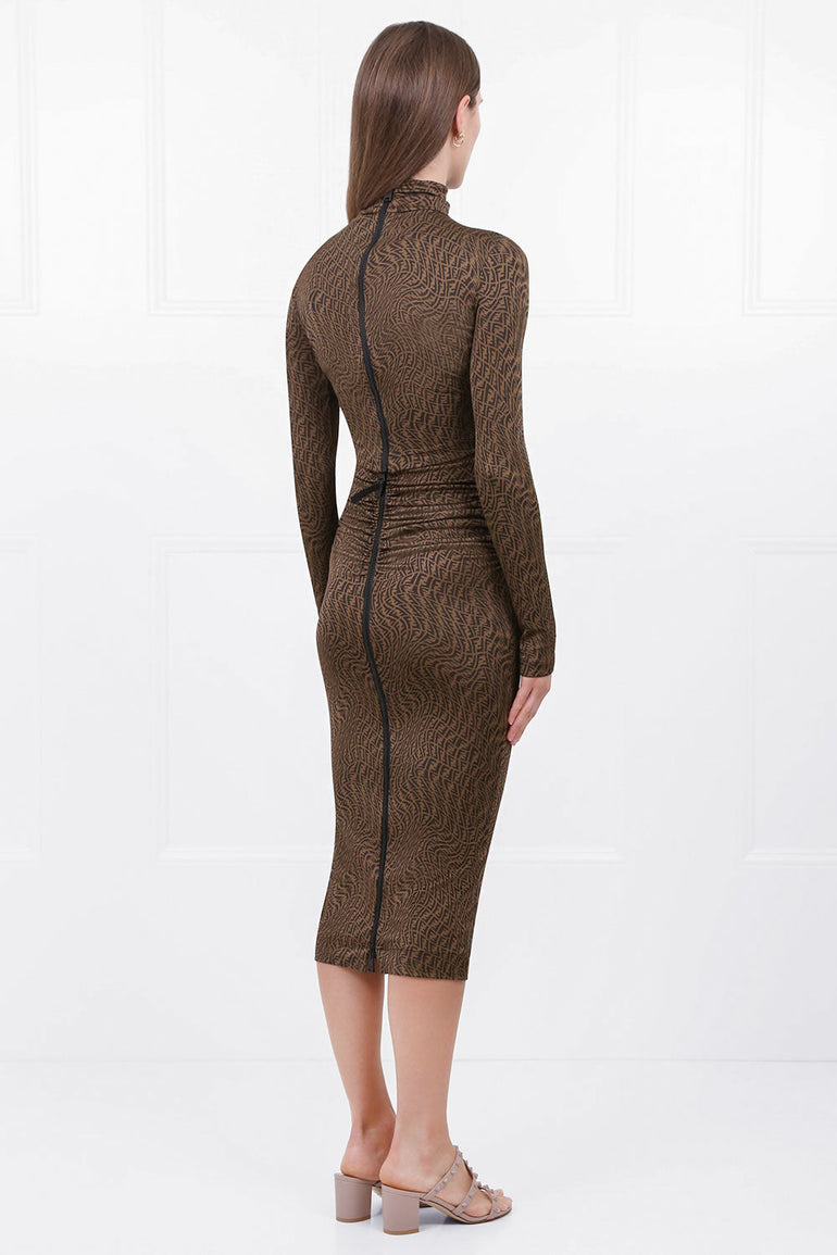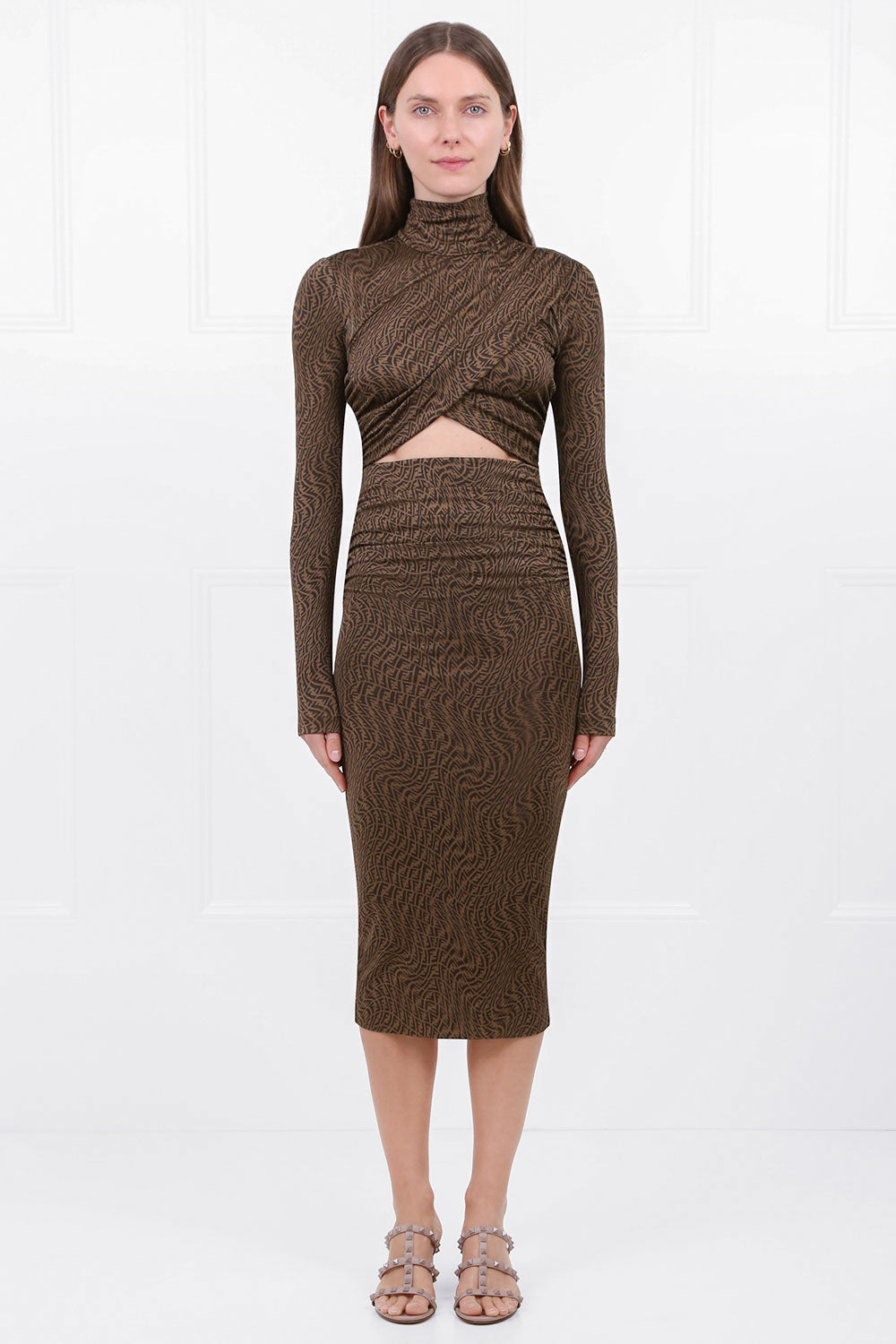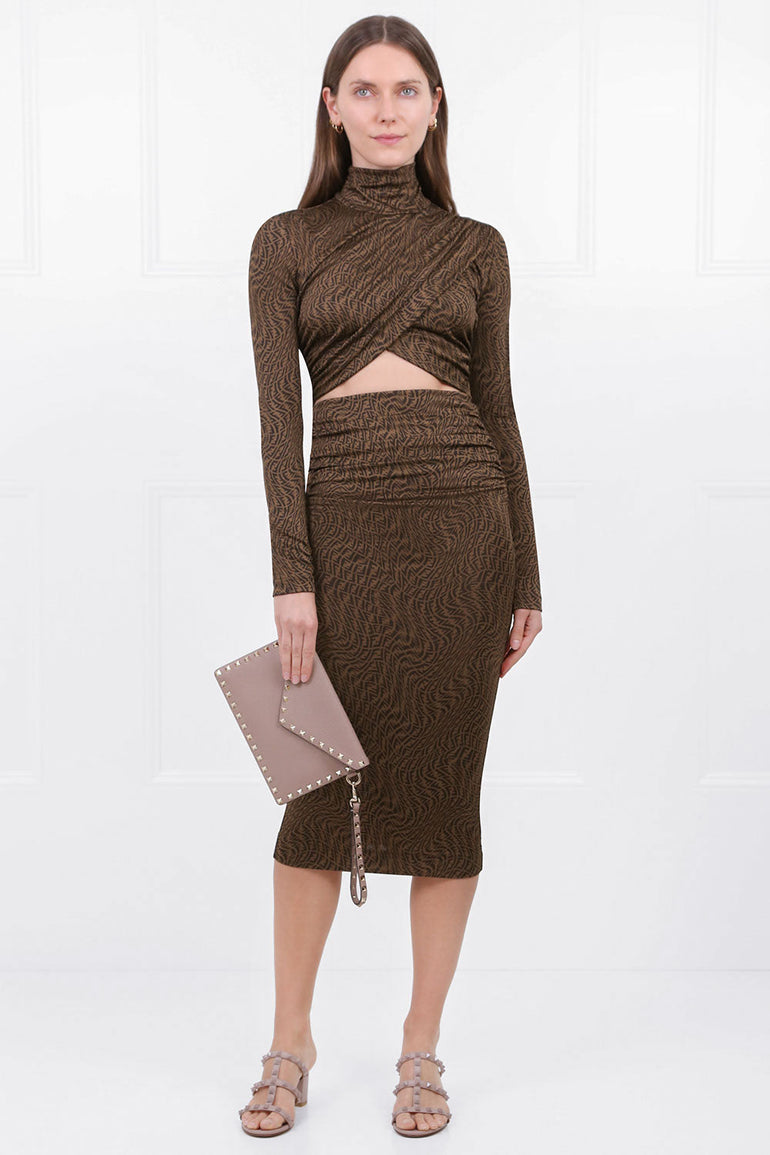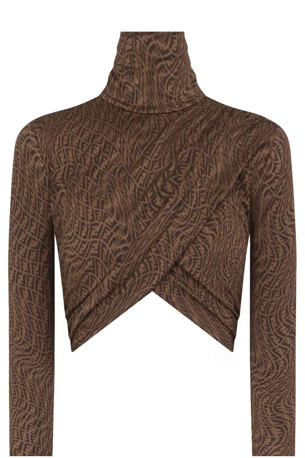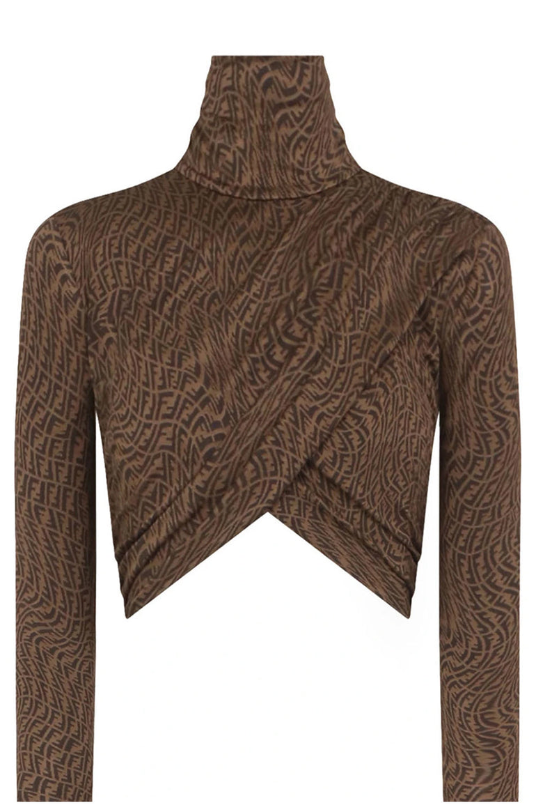 The Fendi FF Vertigo Cropped Top in tobacco is crafted from a stretch fabric in a signature twirled FF print design. This top features folded fabric detailing at the front, a ruched turtle neck and a rear zip fastening.