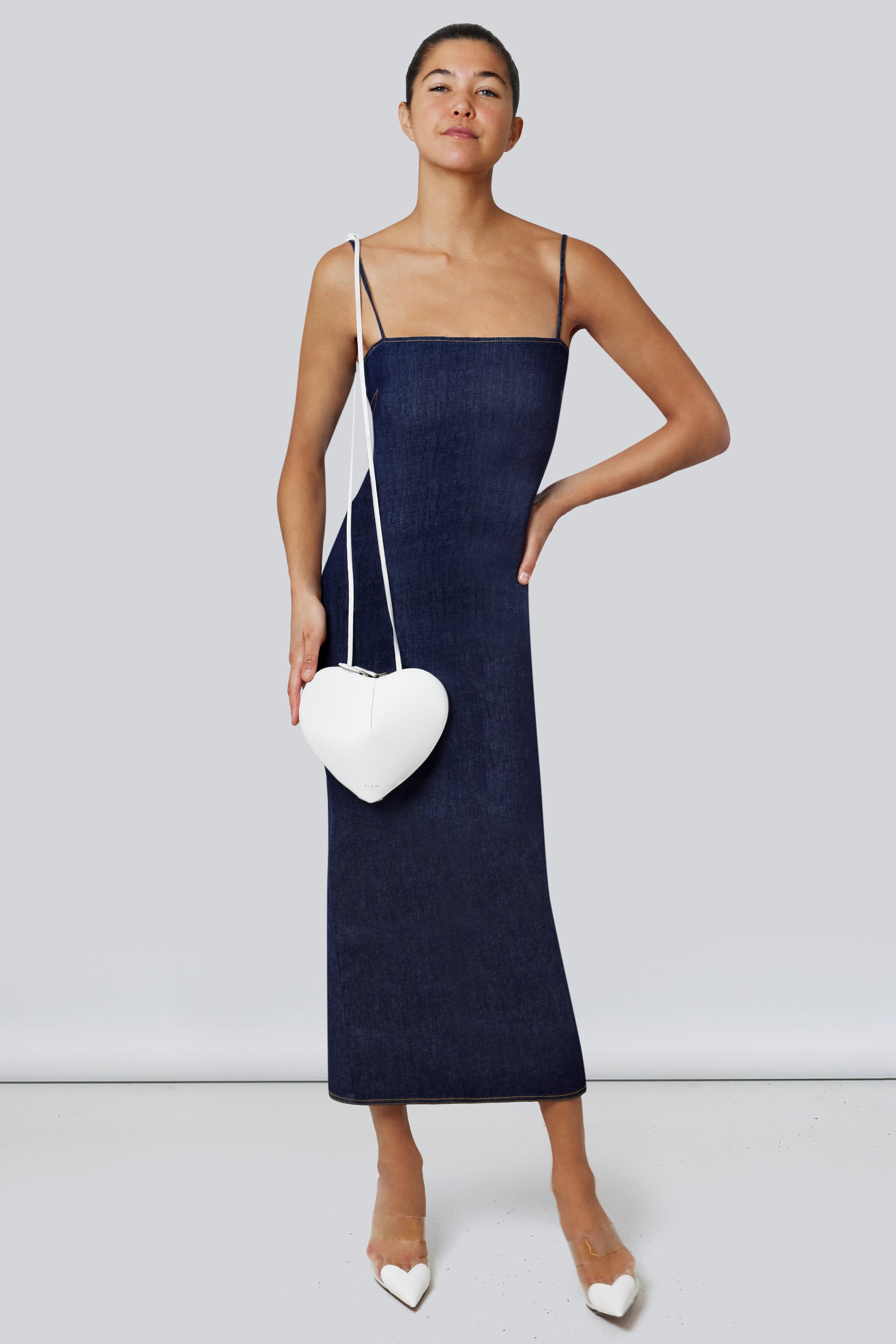 The Alaïa Maxi Fitted Denim Dress, features spaghetti straps and straight neckline. it is a figure hugging and made to size with an invisible zipper on the side. Made from stretch denim, this maxi dress features the iconic Alaïa cross stitches at the Back.