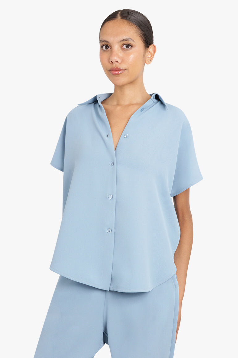The Maison Poi Circle Cap Sleeve Blouse in lake is crafted from a fluid polyester fabric. The blouse features rounded cap sleeves, a centre front button placket, a classic collar and a rounded hem.