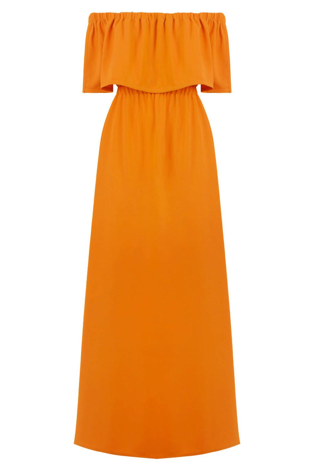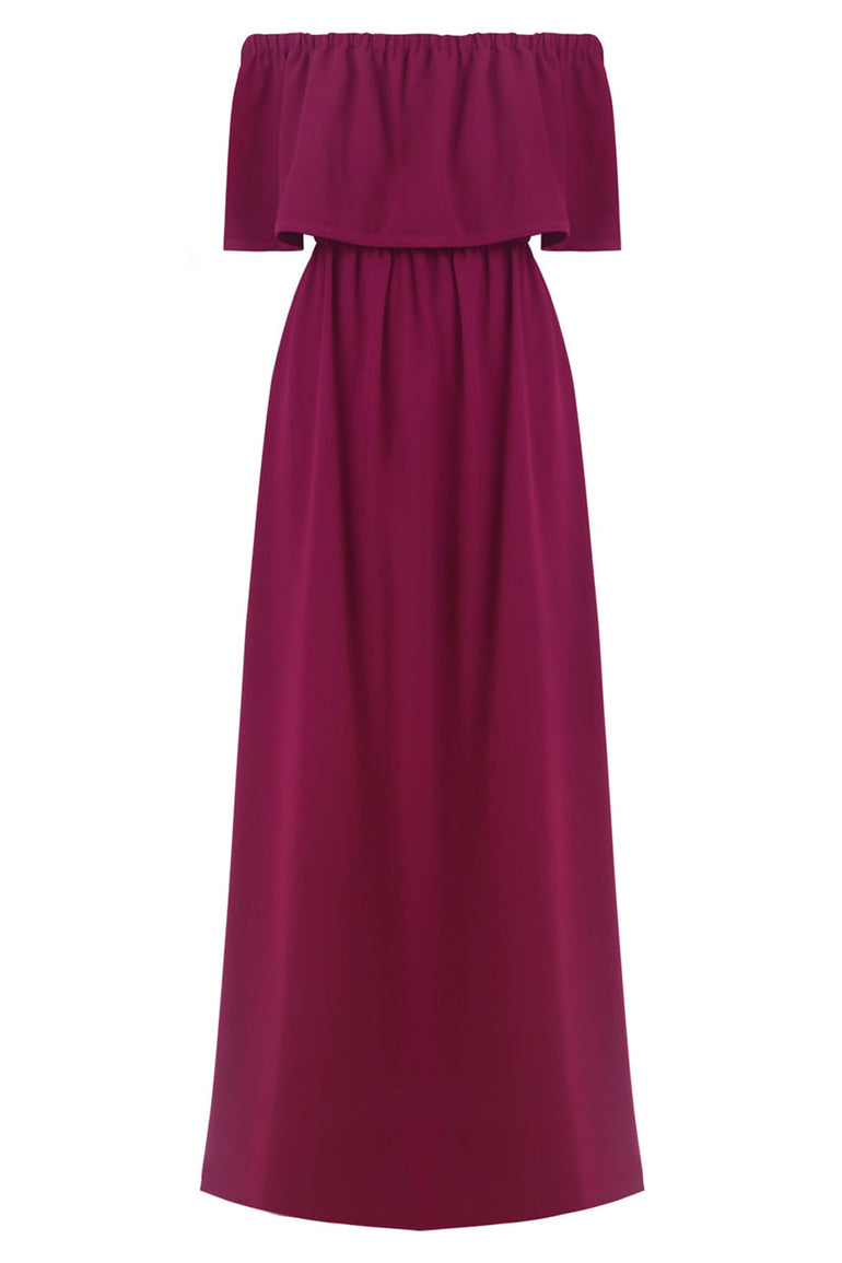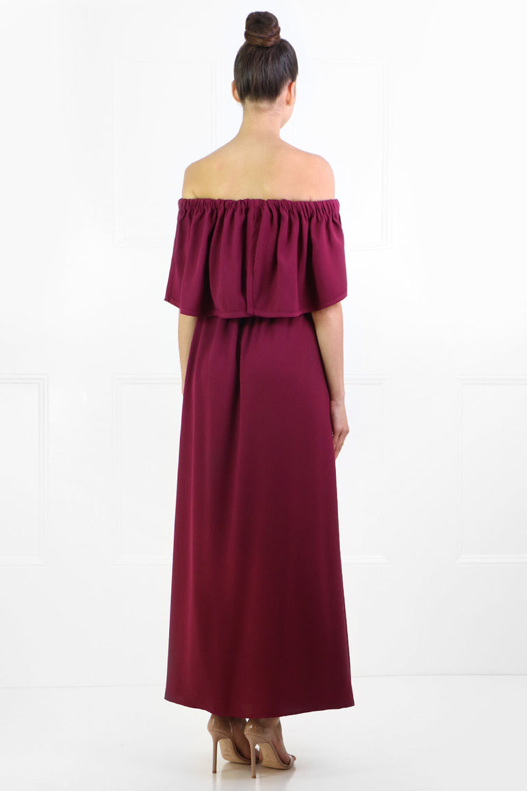The Maison Poi Exposed Shoulder dress is an off the shoulder dress with an elasticated layered ruffle detail. It is a maxi length and also features an elasticated waistband.