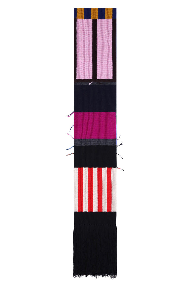 The Colville Football Scarf in Multi is crafted from luxurious virgin wool and is comprised of six different colour block panels. This scarf features a frayed effect along the edges and long black fringing.
