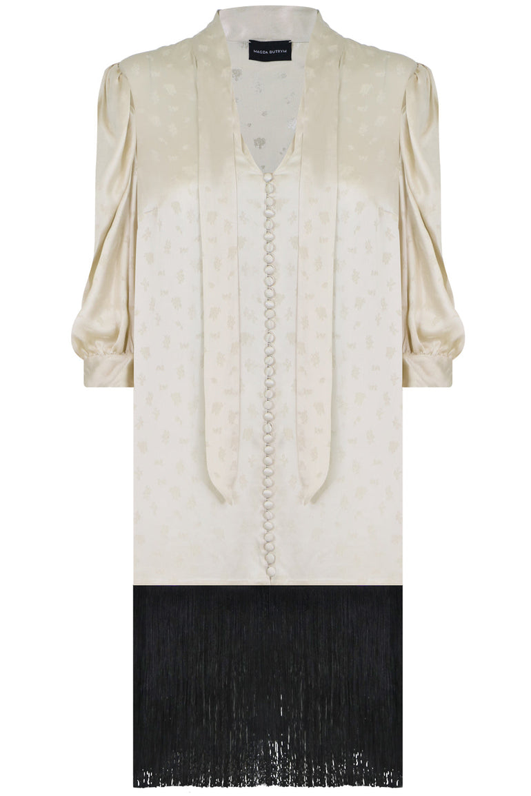 The Magda Butrym Gaza dress is designed with buttons along the front, a fringed hem and tie accents at the neck and sleeves. This is an unlined, knee-length style with shift silhouette.