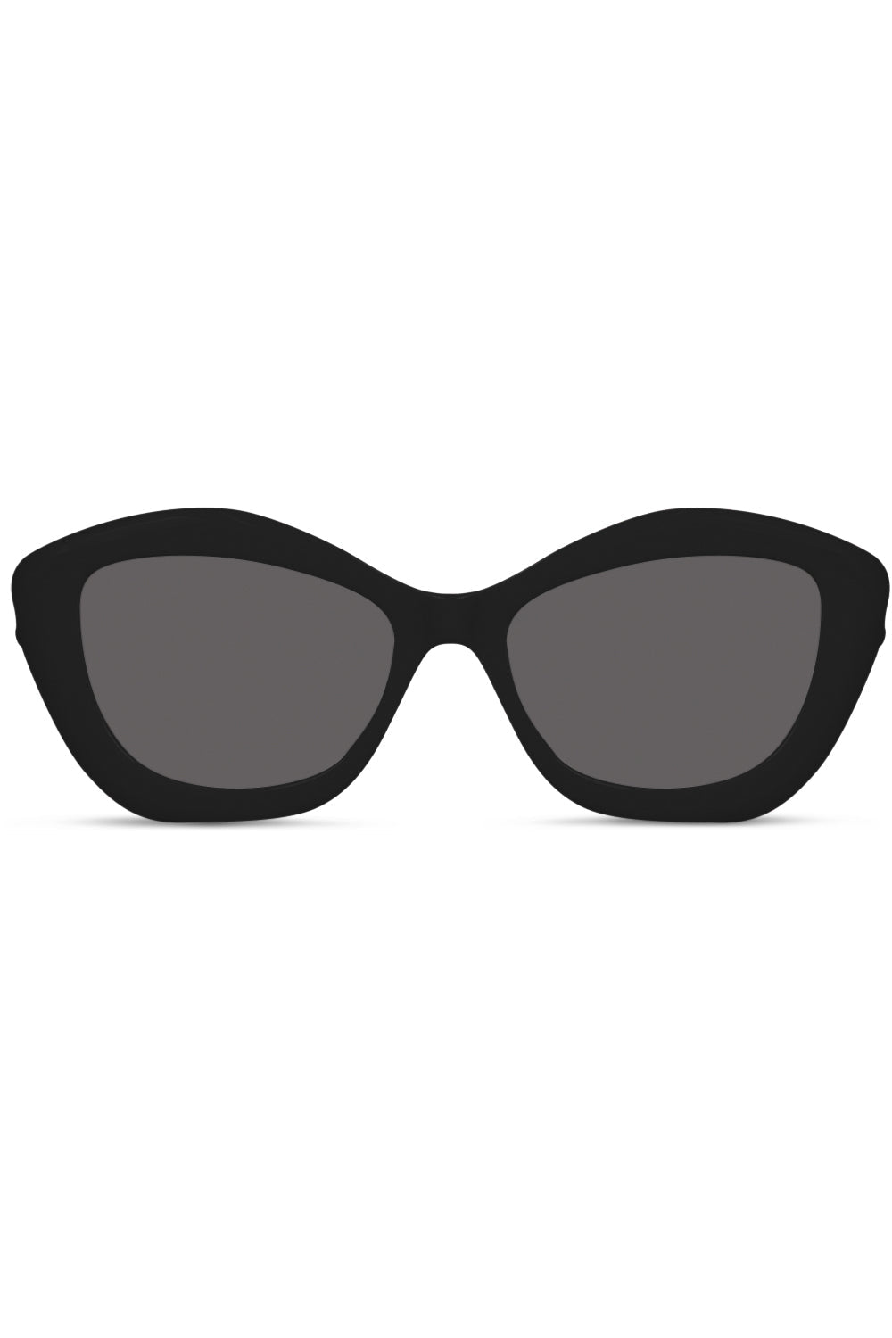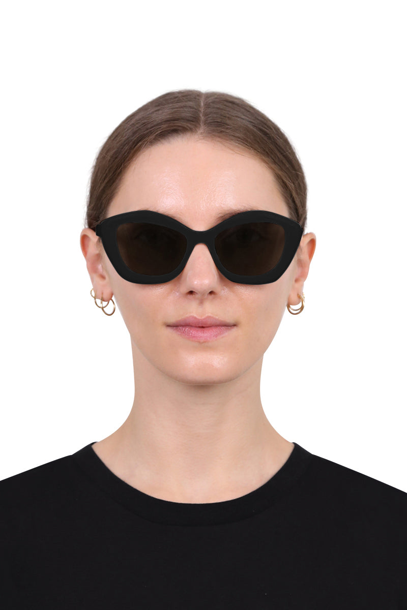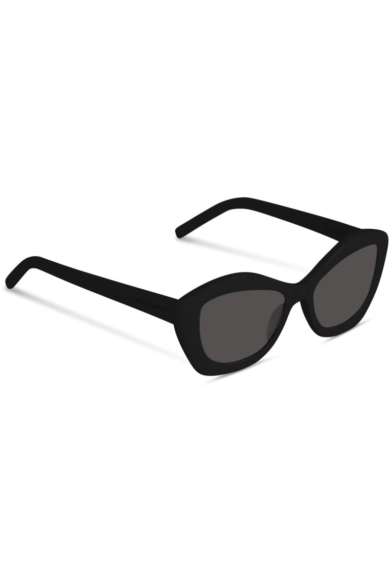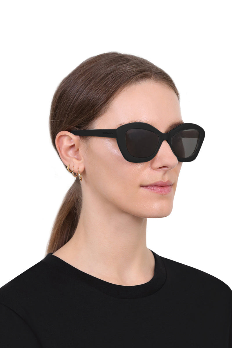The Saint Laurent 68 Geometric Sunglasses are crafted from acetate. This style features an enlarged black, cat-eye frame with the brand's logo embossed in silver on the temples, and black lenses.