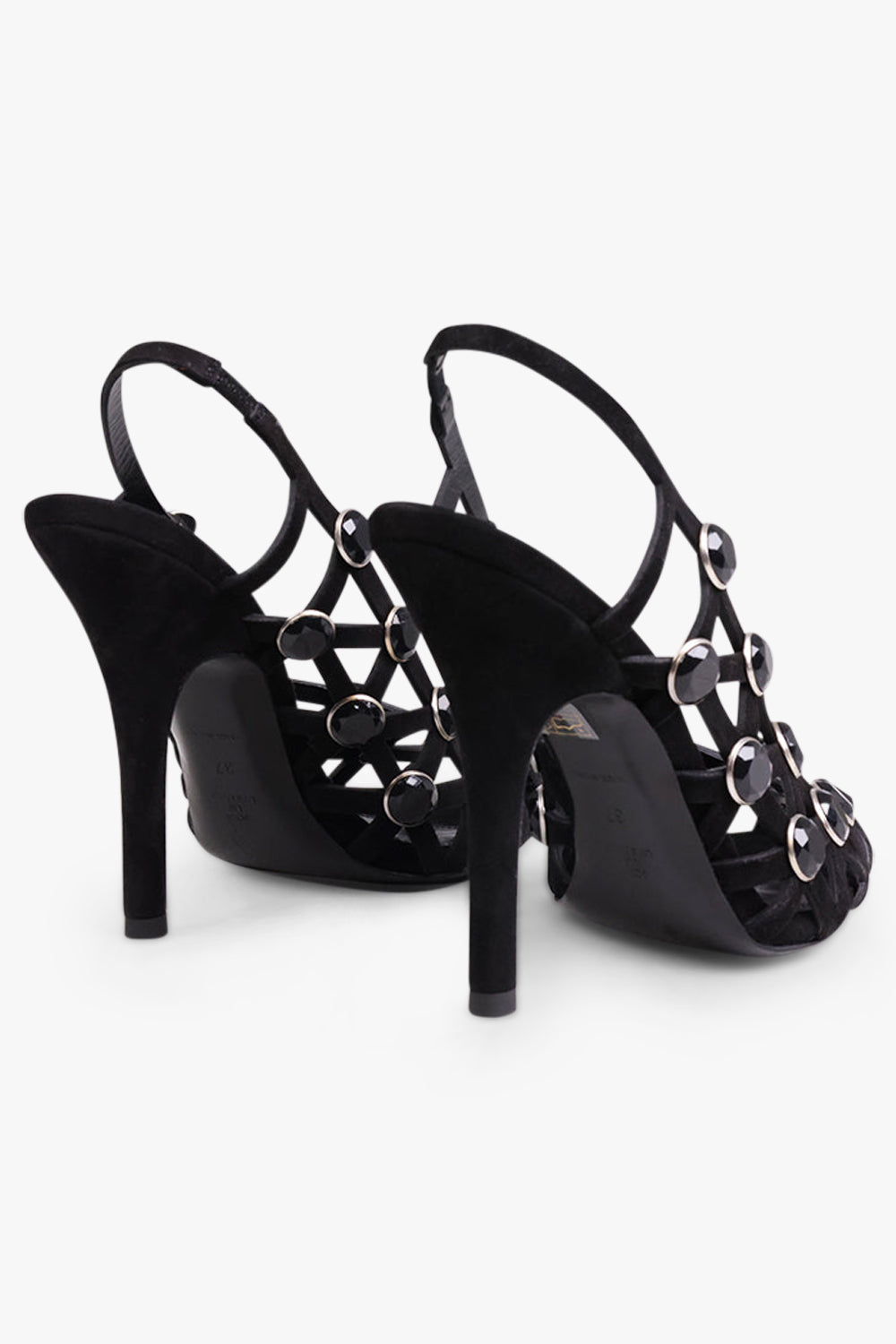 Suede Grid slingbacks black mesh upper applied black crystals small rear elastic padded insole leather sole composition