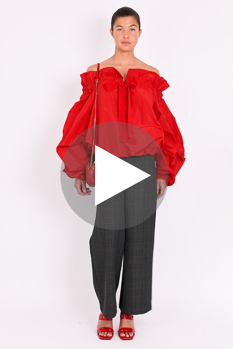 Printed organic cotton lipstick red poplin top. High volume silhouette that can be worn knotted at the neck or off the shoulders. Drawstring collar with flounce at the front and long grosgrain ties. Batwing sleeves with elasticated cuffs. Elasticated waist.